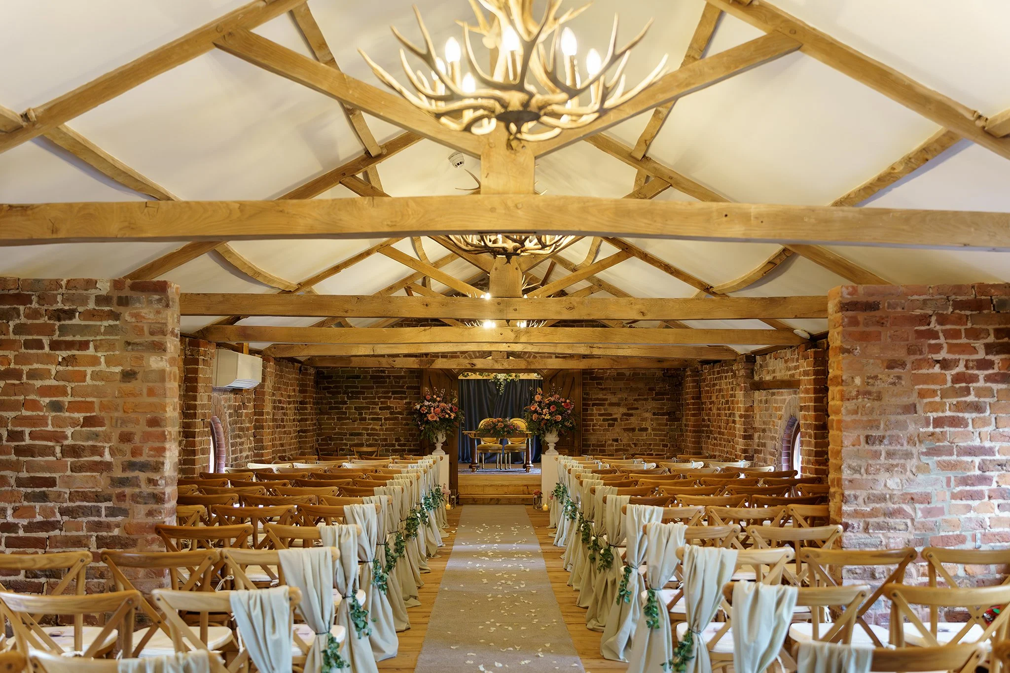 The first floor Ceremony Room can seat 150 guests and features vintage brick walls, exposed beams and antler chandeliers for a charming countryside feel. Alternatively couples can opt for an outdoor ceremony of up to 300 guests in the paved Secret Garden, or out on the lawns overlooked by a cherub fountain. Dinner is served in the Main Barn, a spacious room with a soaring vaulted ceiling that can seat up to 200 guests, and has doors which open onto the Secret Garden and the terrace to bring the outside in on warm days. Burlton Manor’s extensive grounds feature lots of lovely spots for couples portraits, including the garden temple, dual oak swing and the lavender bridge. Burlton Manor can be hired for one or two days, has a range of accommodation options for up to 70 guests, and couples are welcome to bring their dogs (or horses!) to share in their special day.