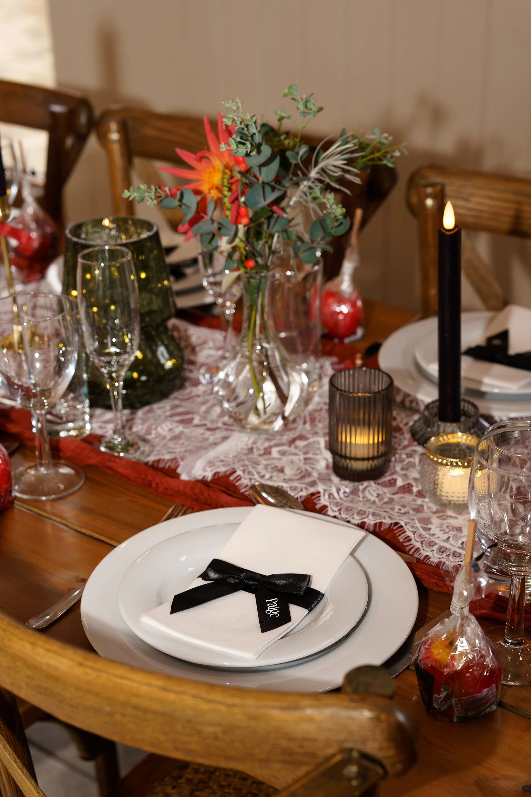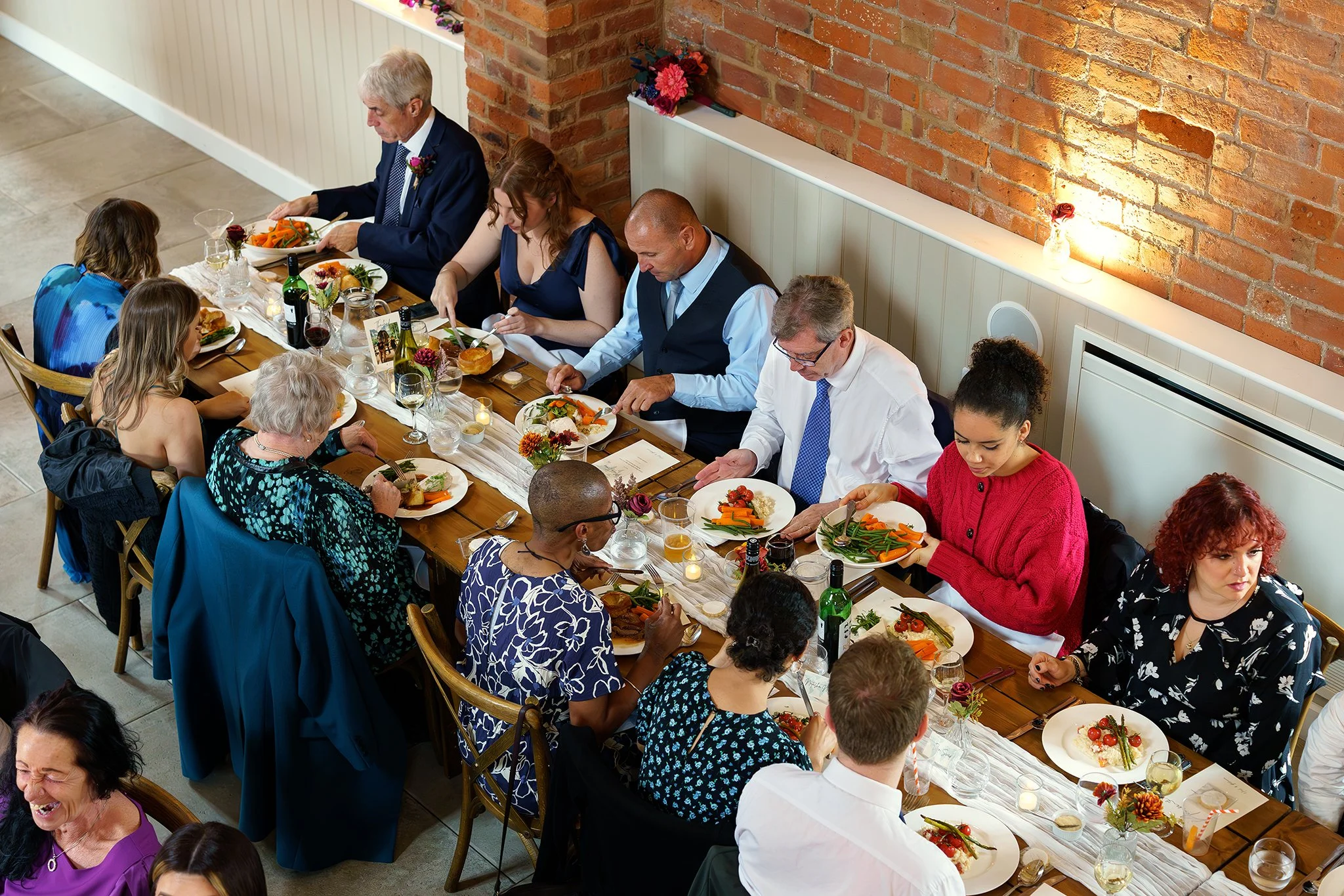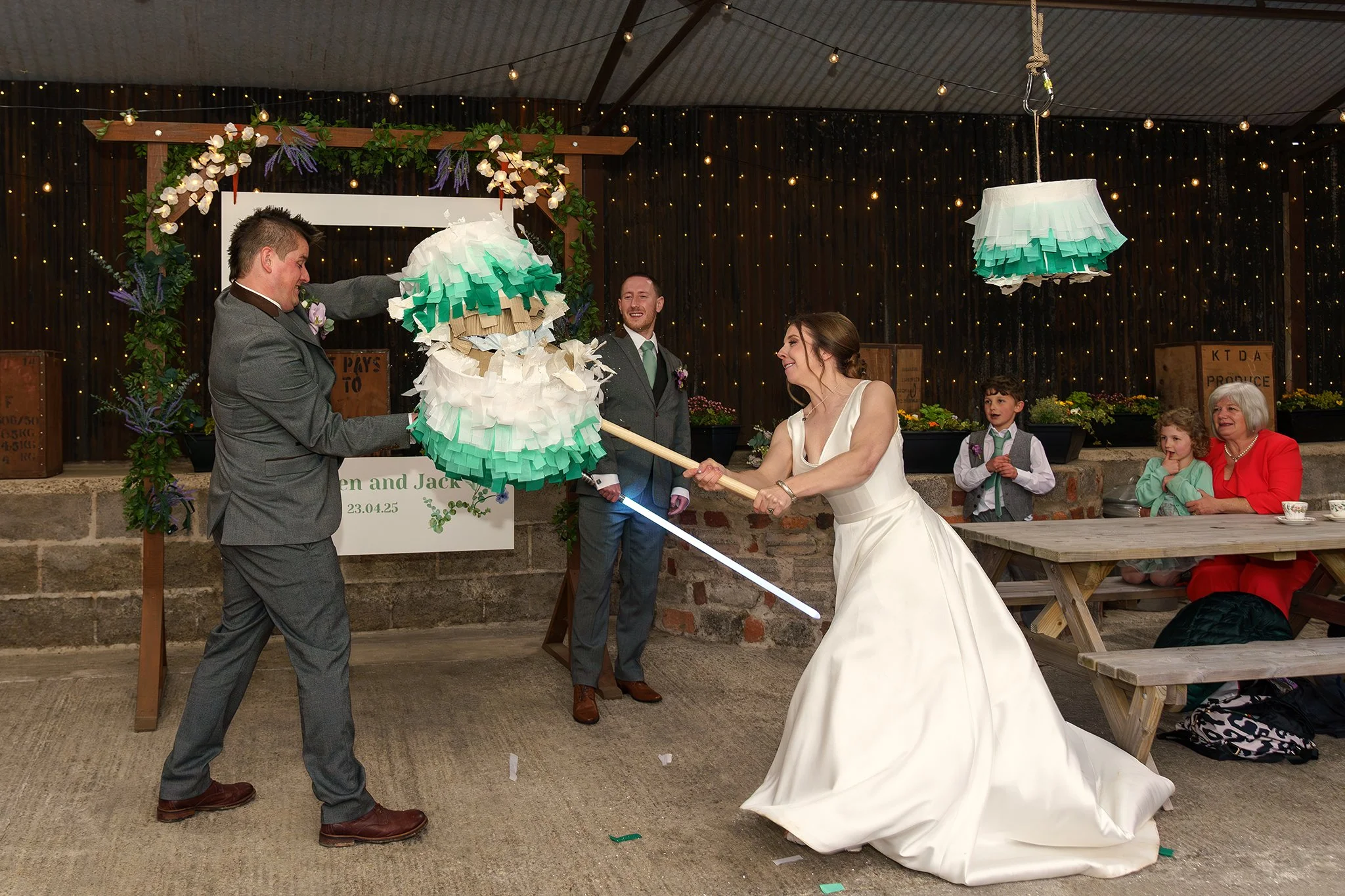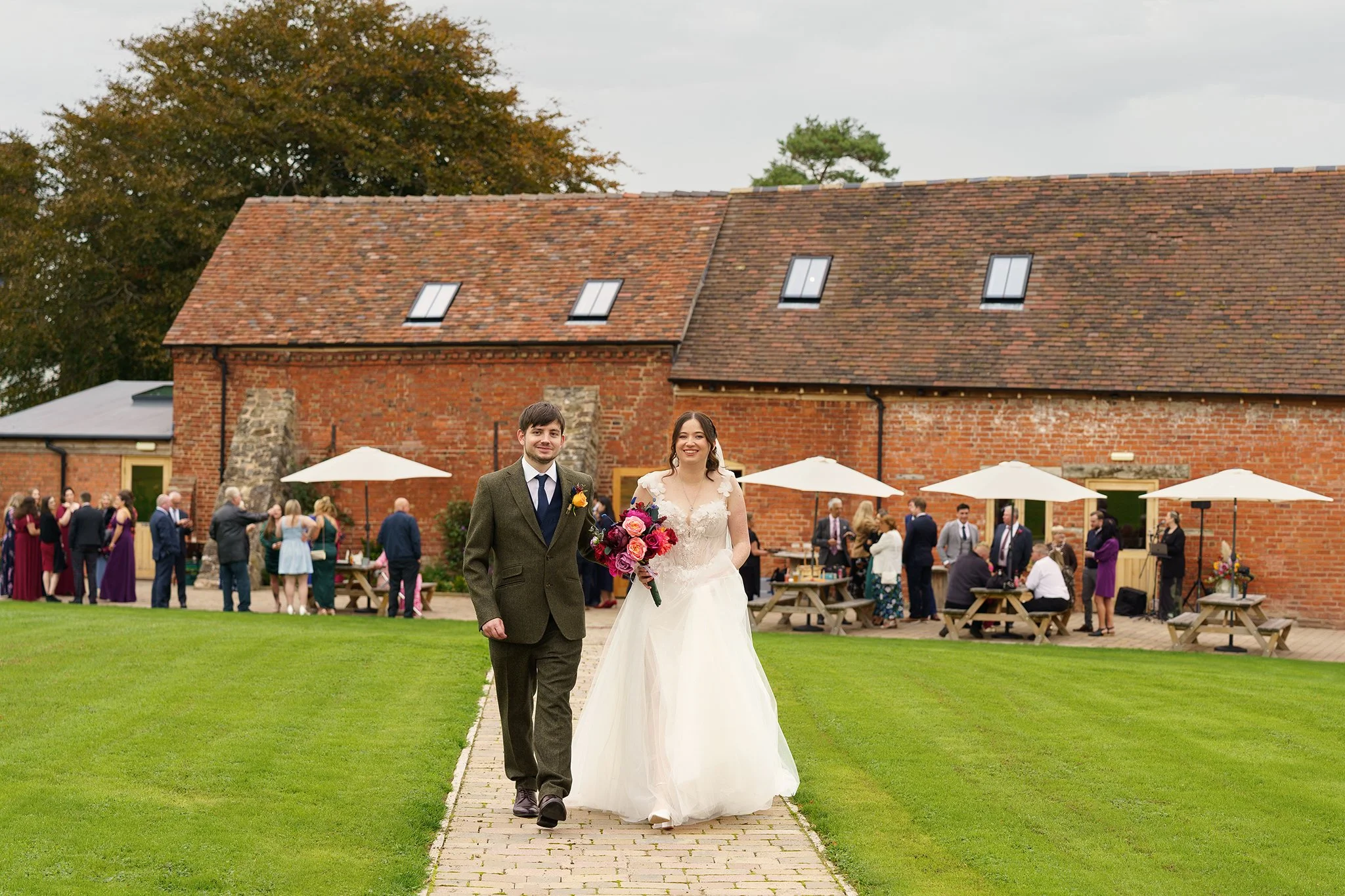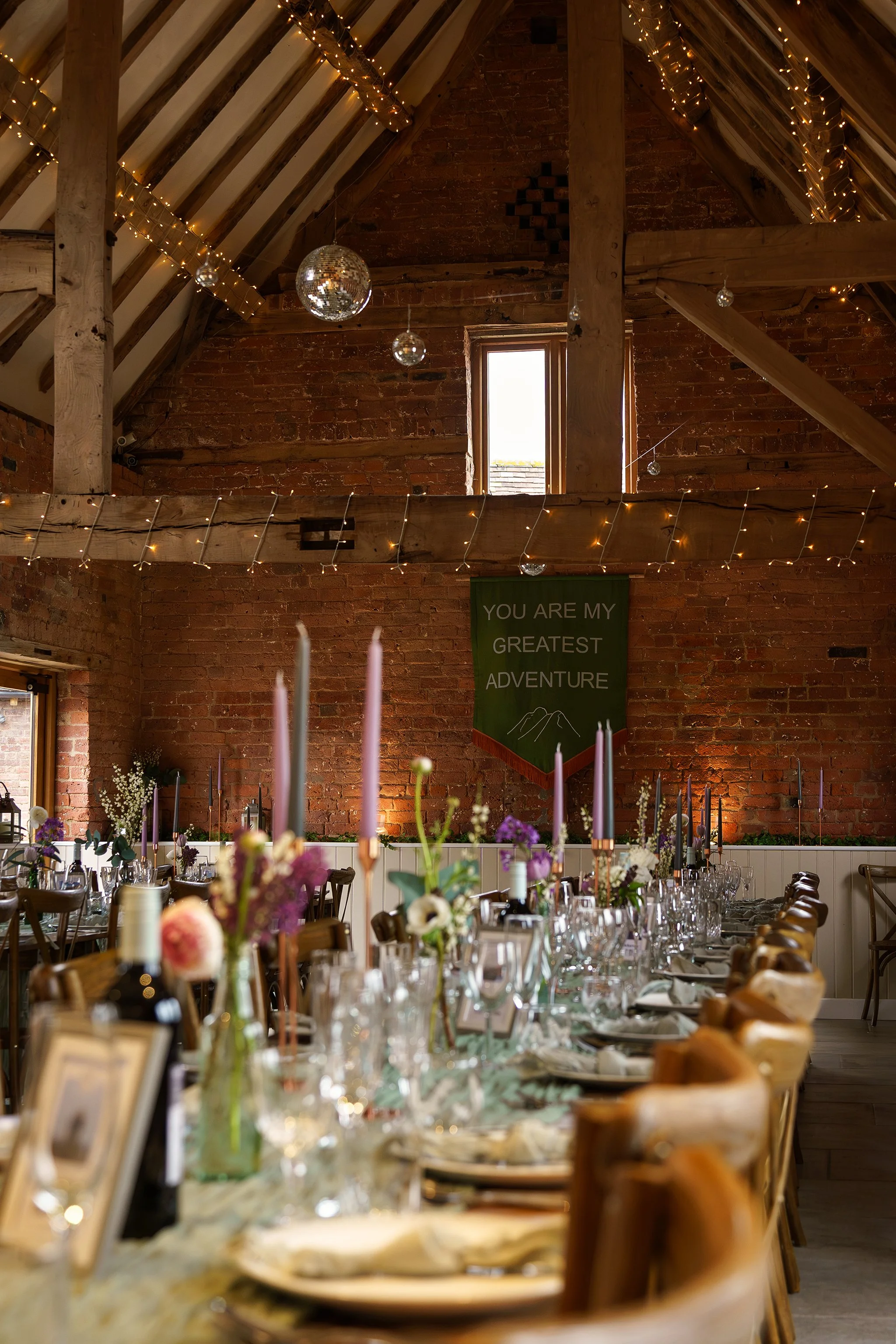 As a dry-hire venue, couples have the freedom to style the barn to their own taste, though the venue’s natural rustic charm—with exposed brick, sturdy oak beams, and sparkling fairy lights—means you don’t need much décor to create a stunning atmosphere. A new addition to the barn is the cosy mezzanine-level Hayloft, which provides a charming setting for indoor ceremonies. For outdoor weddings, the Lakeside gazebo offers a tranquil space to exchange vows, while the Covered Yard offers a sheltered outdoor option, adorned with fairy lights—perfect for unpredictable weather or larger guest lists that may exceed the Hayloft’s capacity. The Covered Yard is also an excellent space for setting up bars, street food trucks, or even fun games.