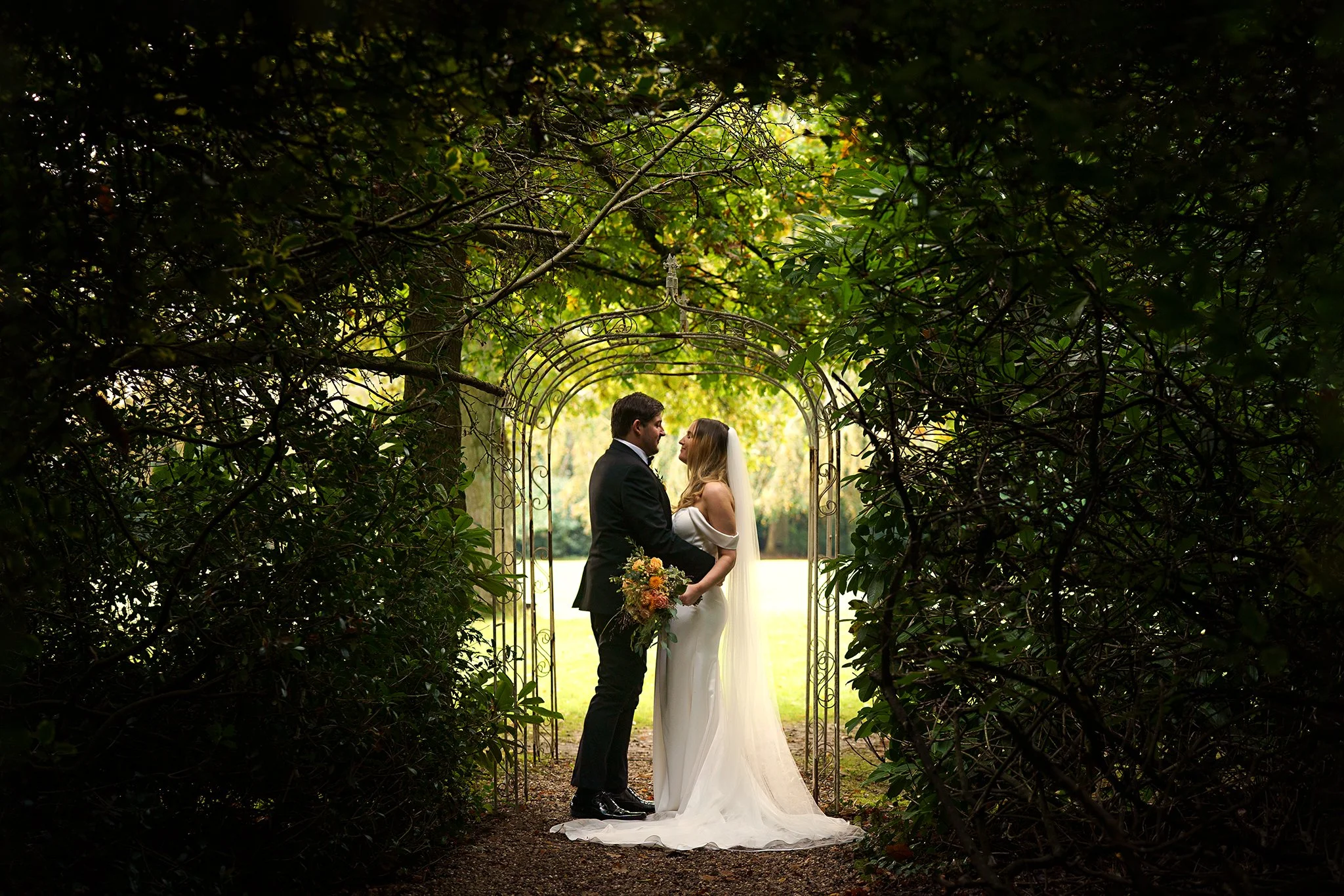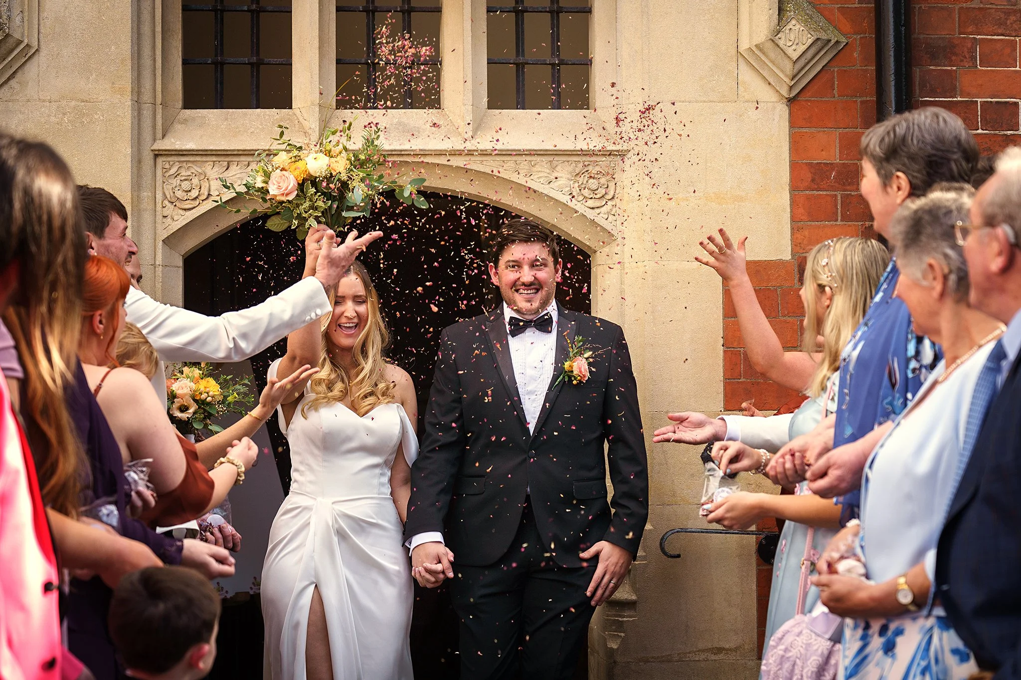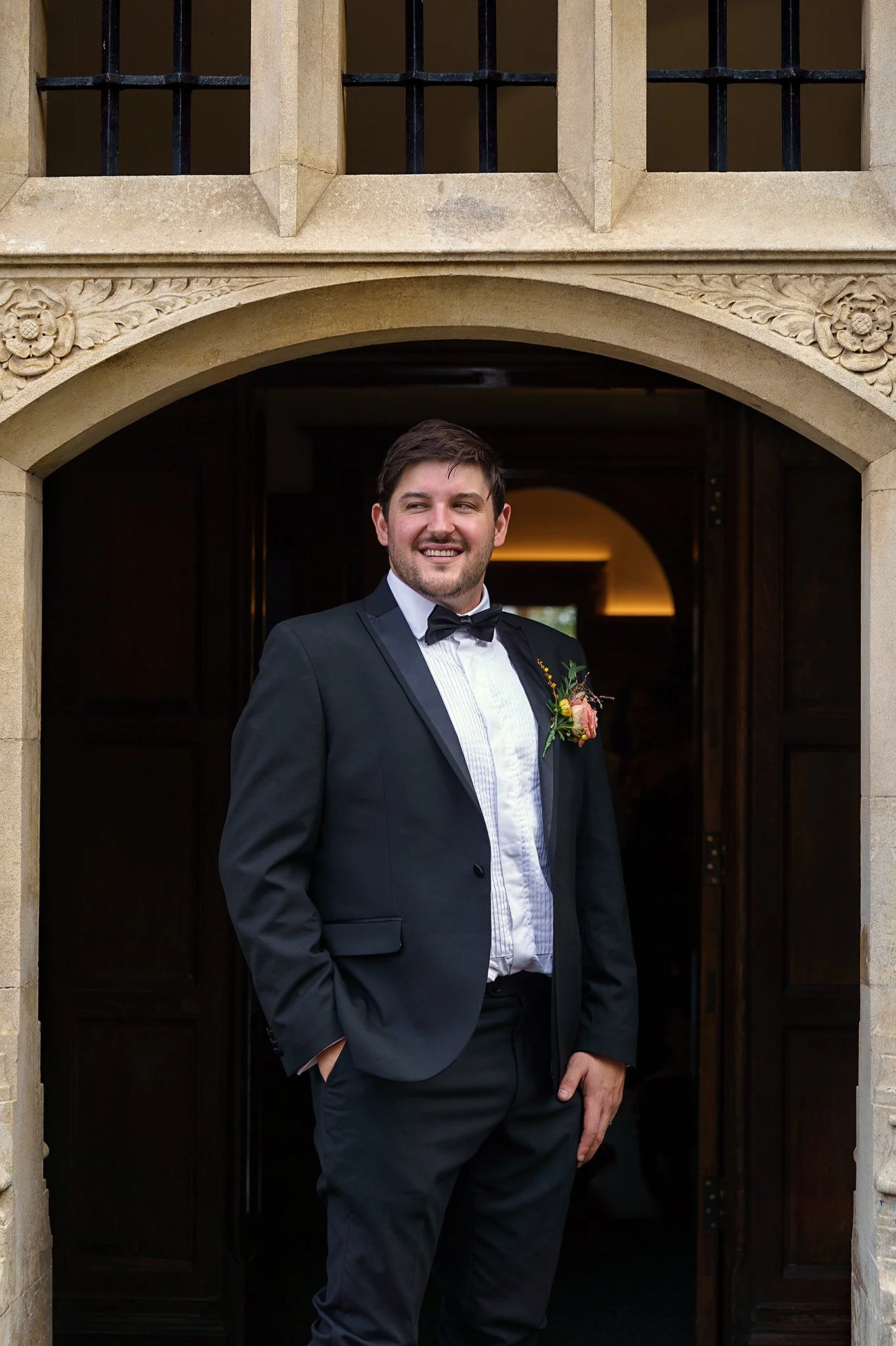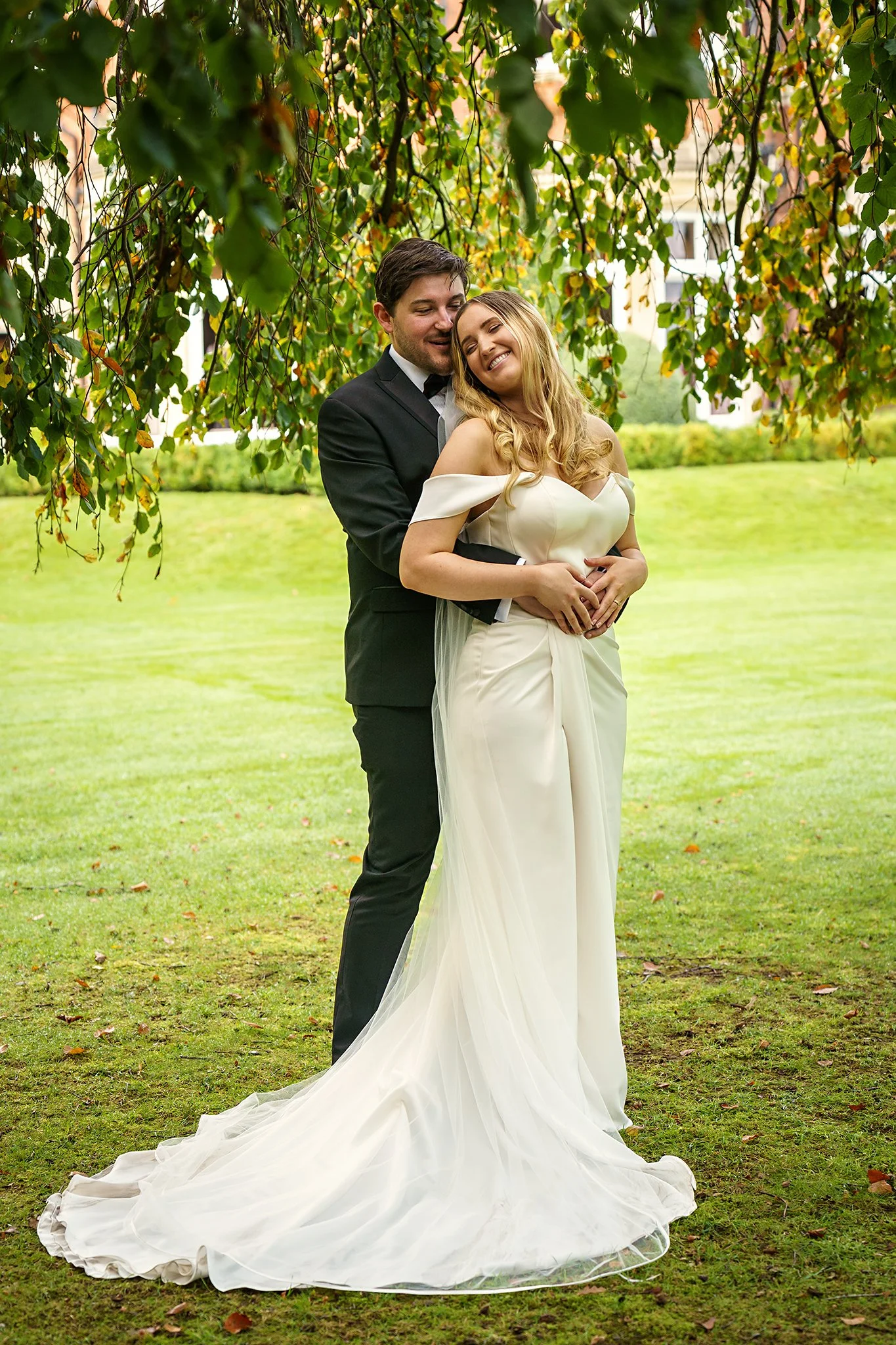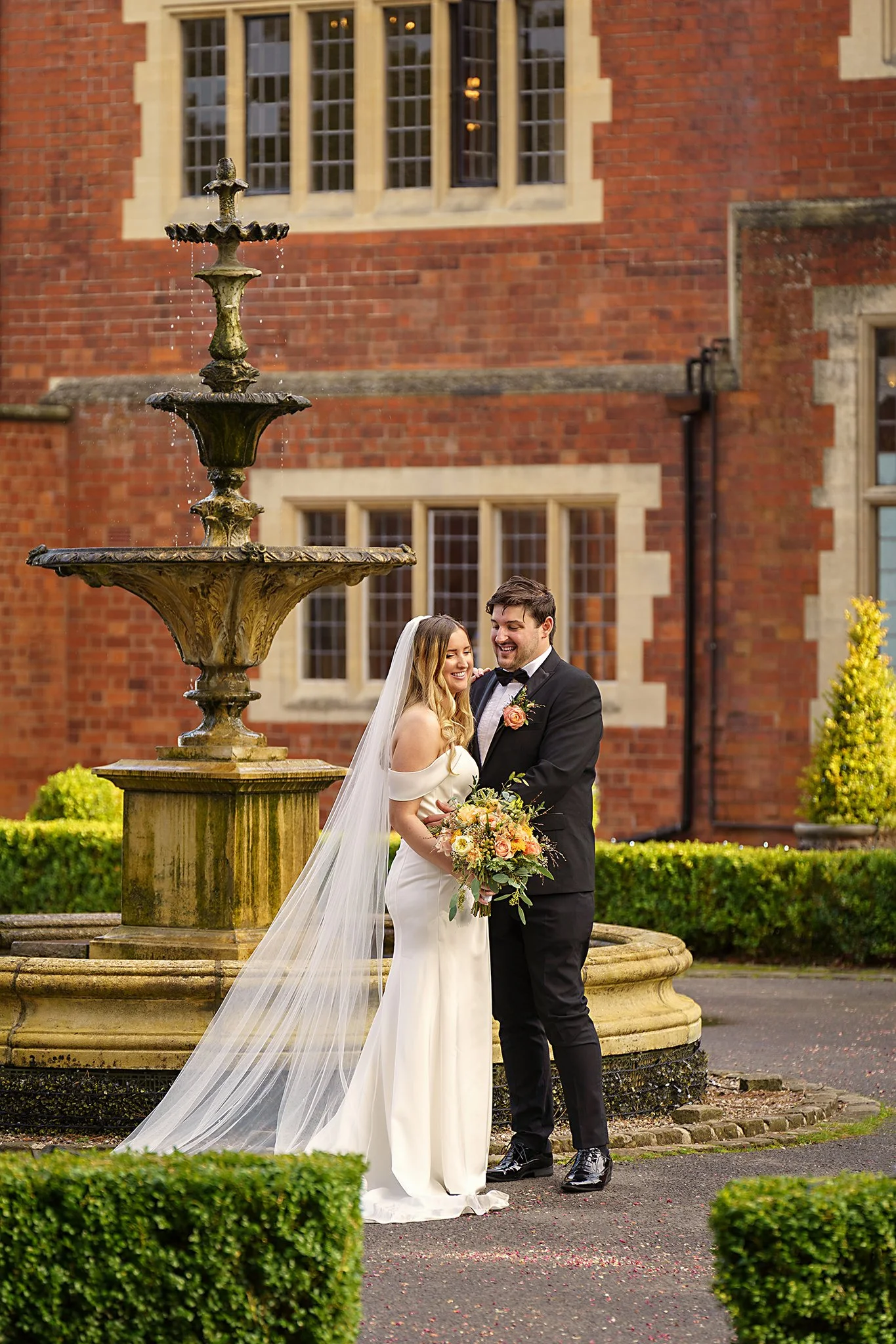 Jo and Nate chose beautiful venue Pendrell Hall, located near Codsall Wood in Staffordshire, for their late October wedding. They opted for a civil ceremony in the lovely Arts and Crafts-style Morning Room, with its gorgeous wooden wall panelling, a decorative arcaded overmantle, and Victorian plasterwork. Jo chose an elegant wedding dress with clean lines, dropped shoulders and a thigh-high split in the skirt that looked fantastic on her, paired with a long veil, while Nate wore a classic tuxedo with black bowtie, in contrast to his groomsmen, who were decked out in cream jackets to contrast with the groom. To match the autumnal date, Jo’s bouquet featured soft peachy, russet and gold-hued flowers.