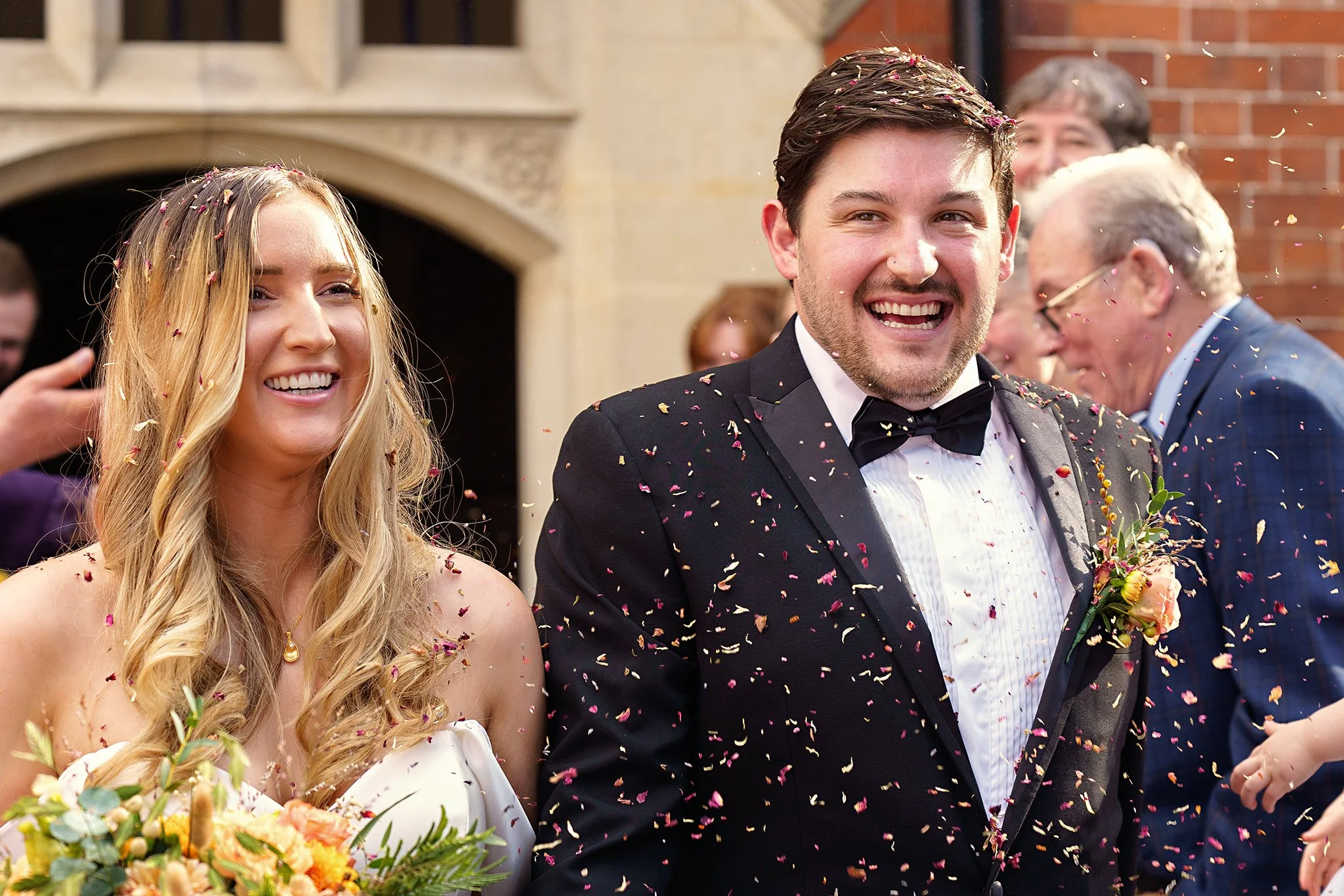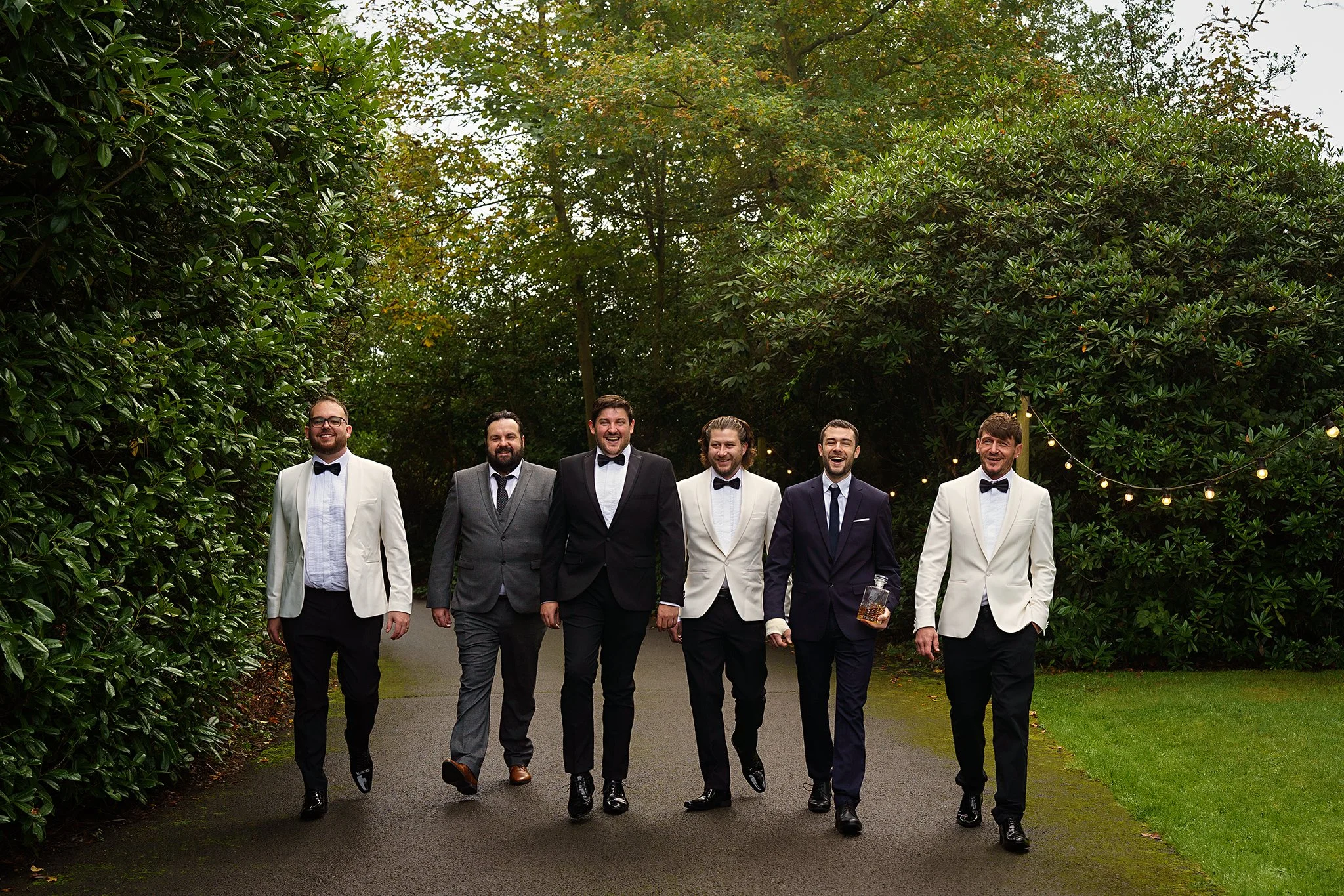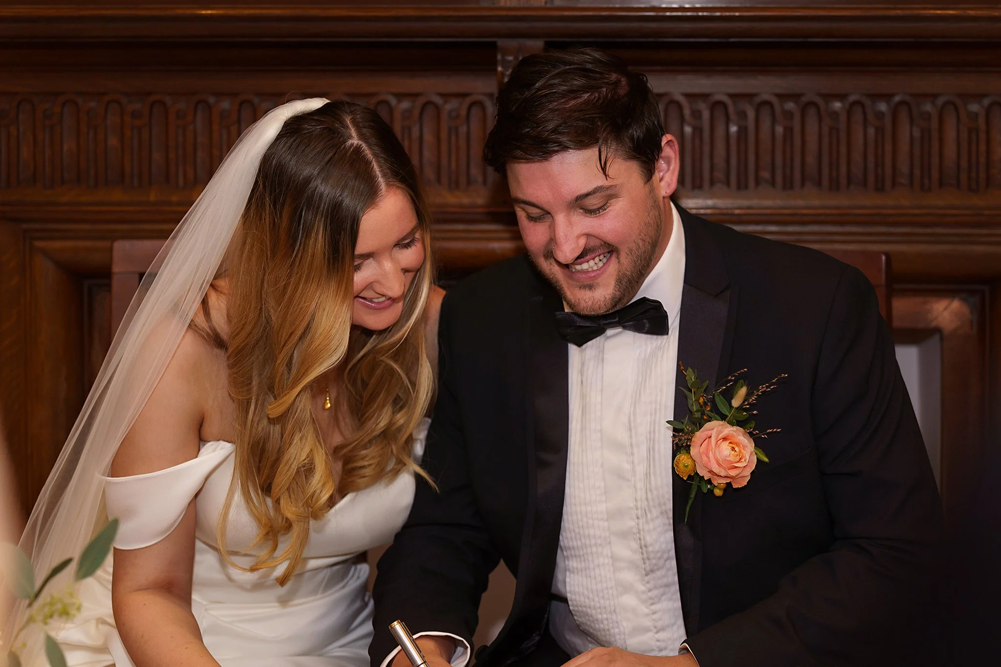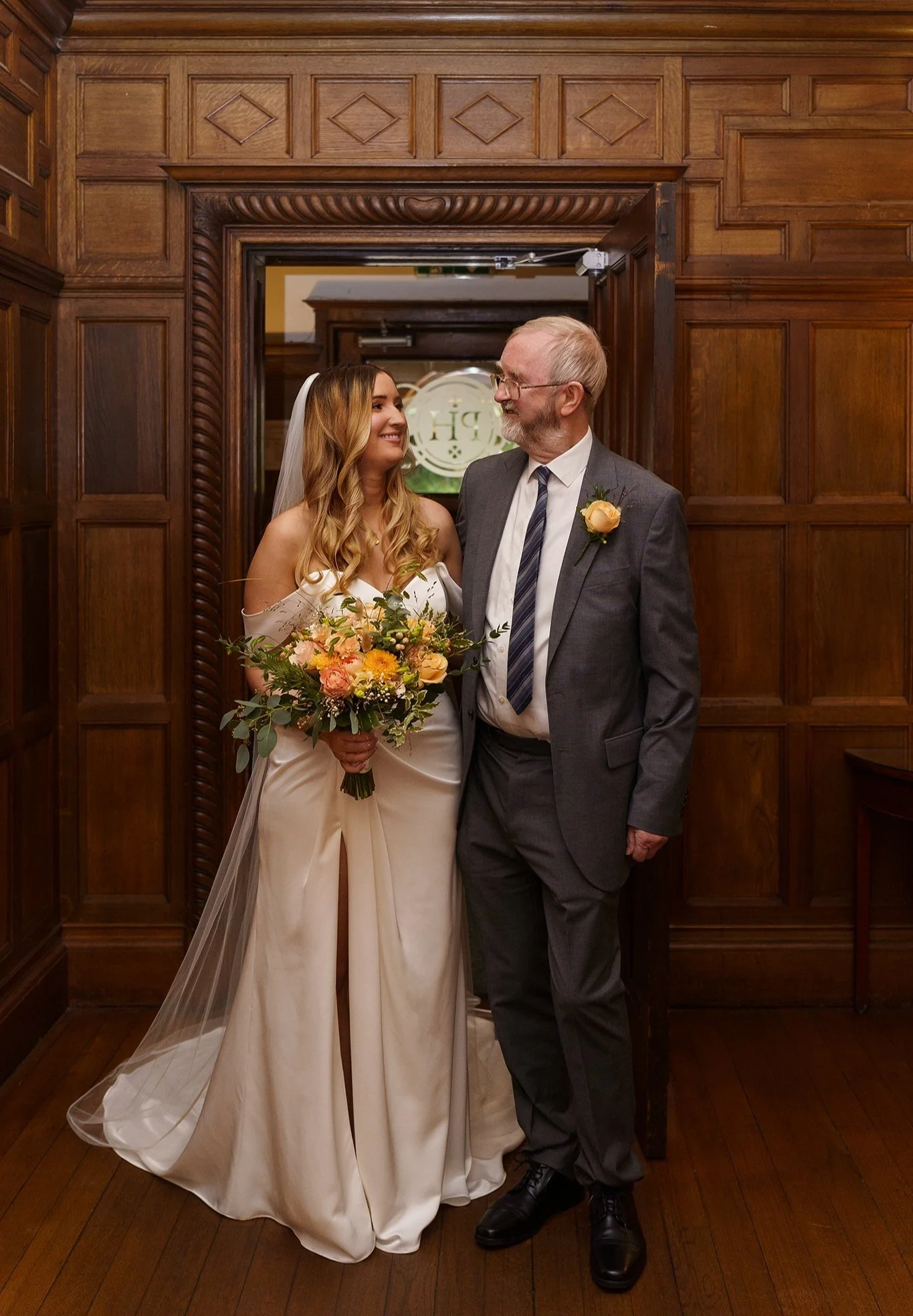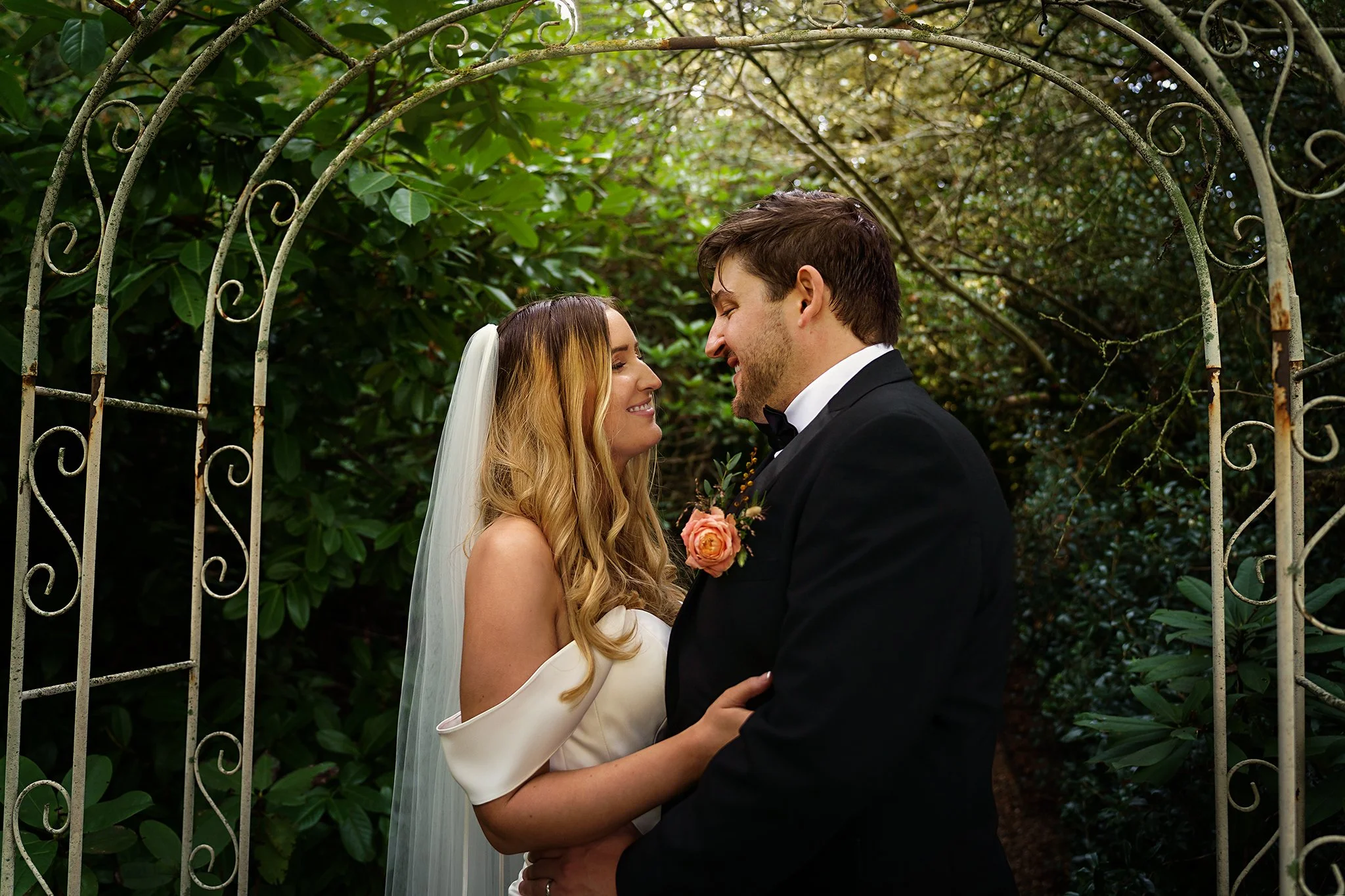 Jo and Nate chose beautiful venue Pendrell Hall, located near Codsall Wood in Staffordshire, for their late October wedding. They opted for a civil ceremony in the lovely Arts and Crafts-style Morning Room, with its gorgeous wooden wall panelling, a decorative arcaded overmantle, and Victorian plasterwork. Jo chose an elegant wedding dress with clean lines, dropped shoulders and a thigh-high split in the skirt that looked fantastic on her, paired with a long veil, while Nate wore a classic tuxedo with black bowtie, in contrast to his groomsmen, who were decked out in cream jackets to contrast with the groom. To match the autumnal date, Jo’s bouquet featured soft peachy, russet and gold-hued flowers.