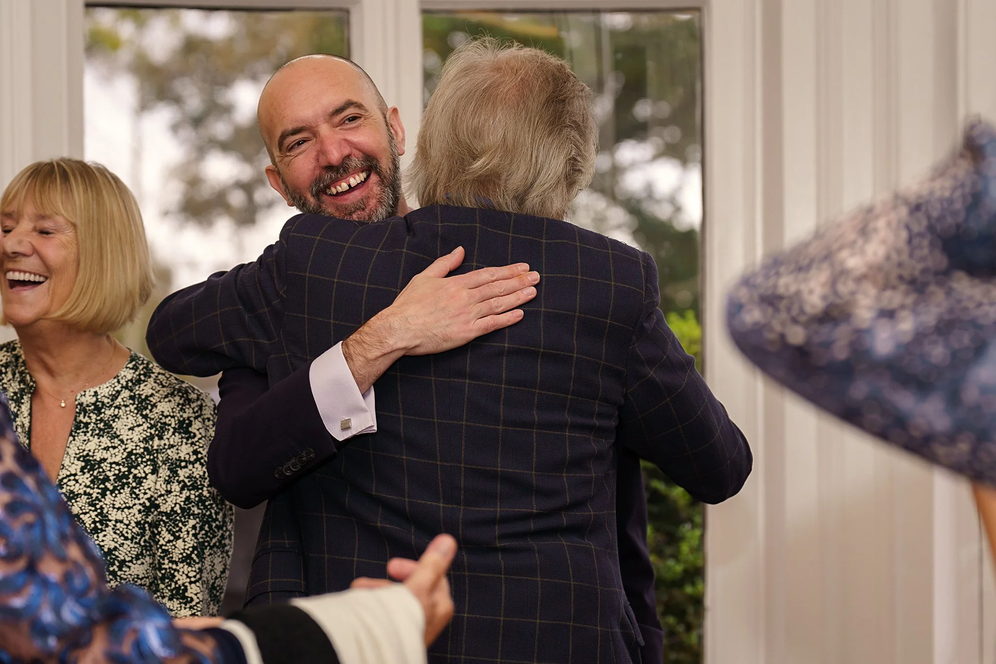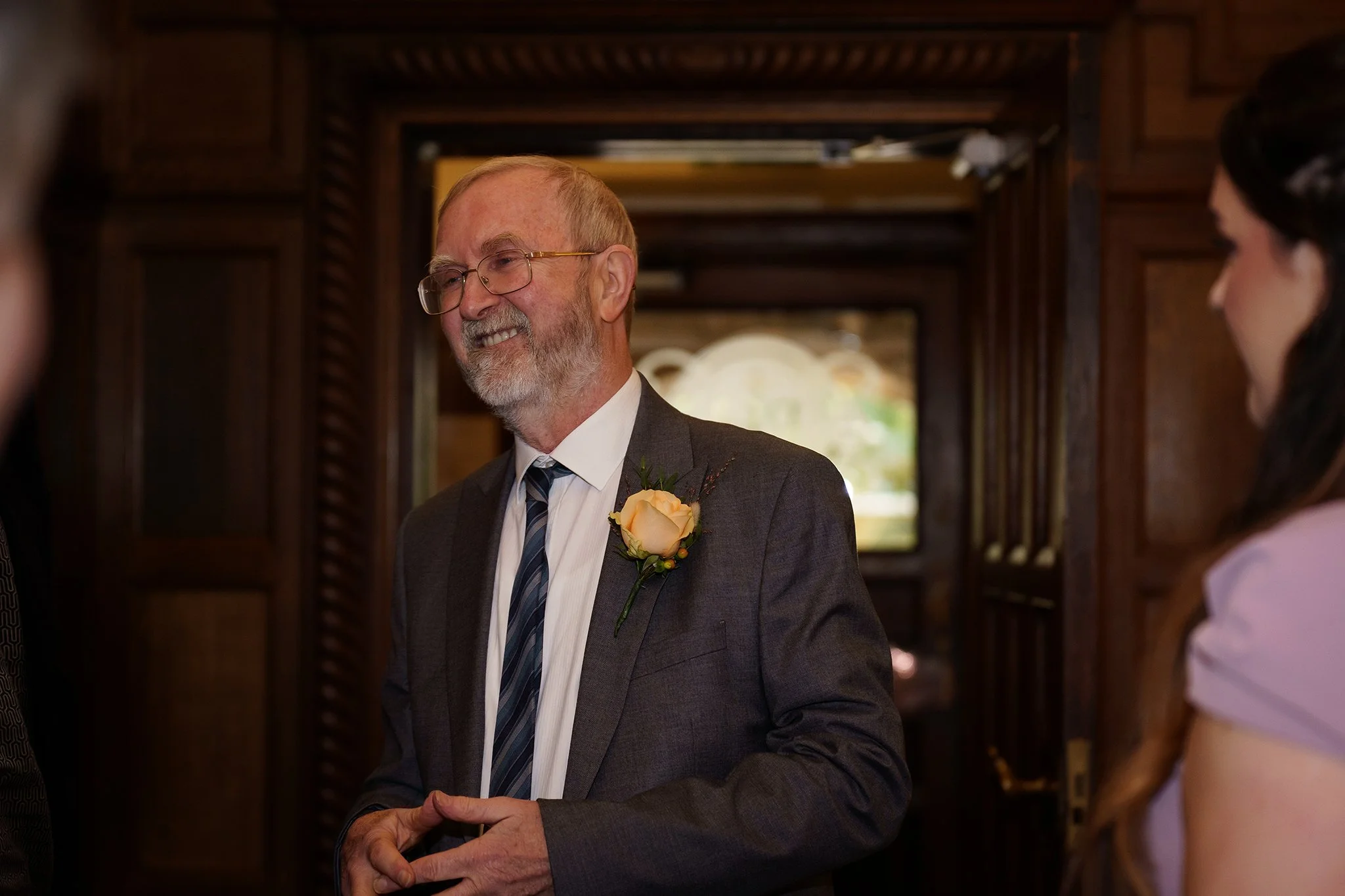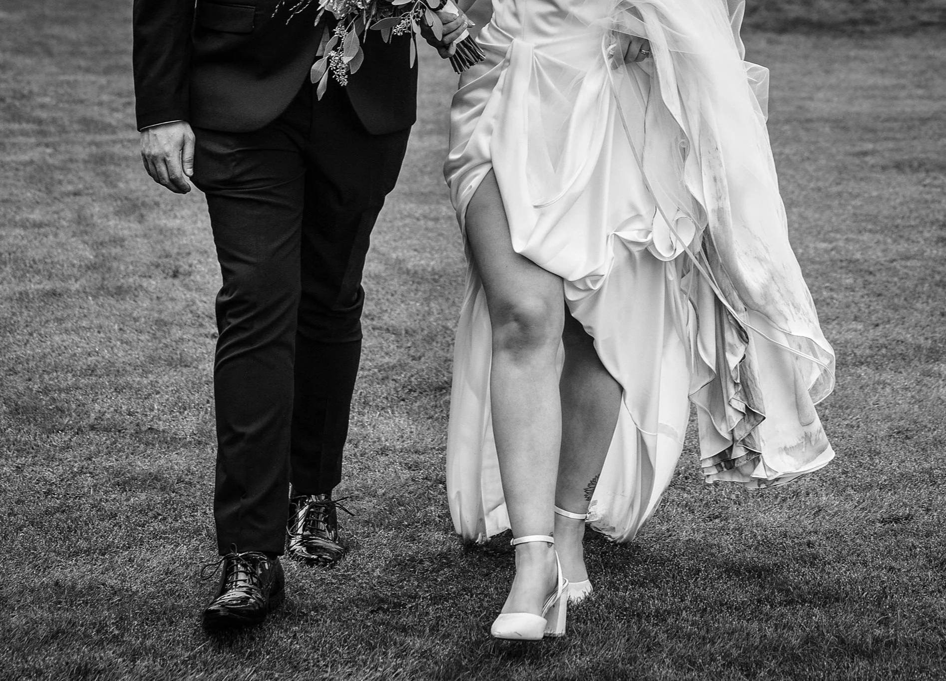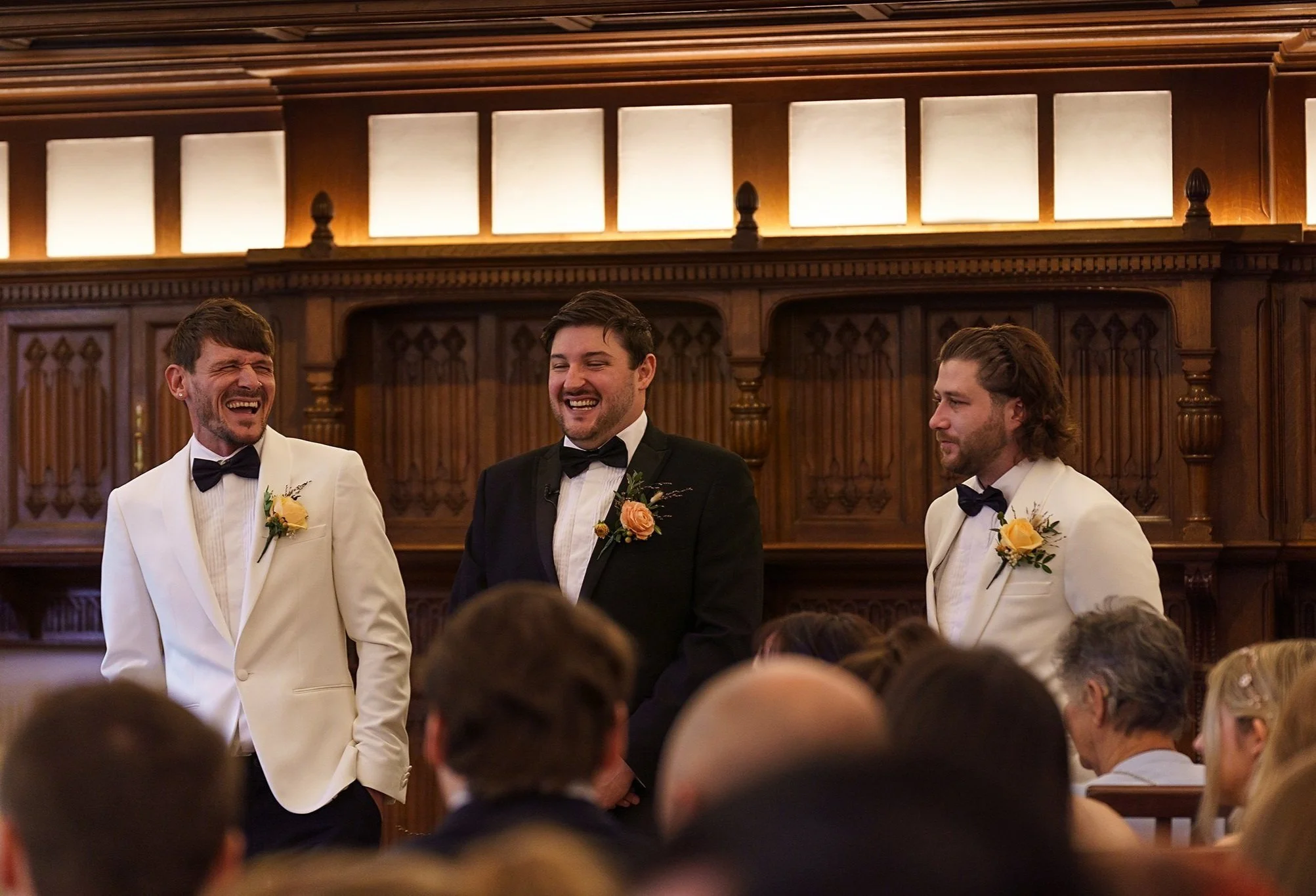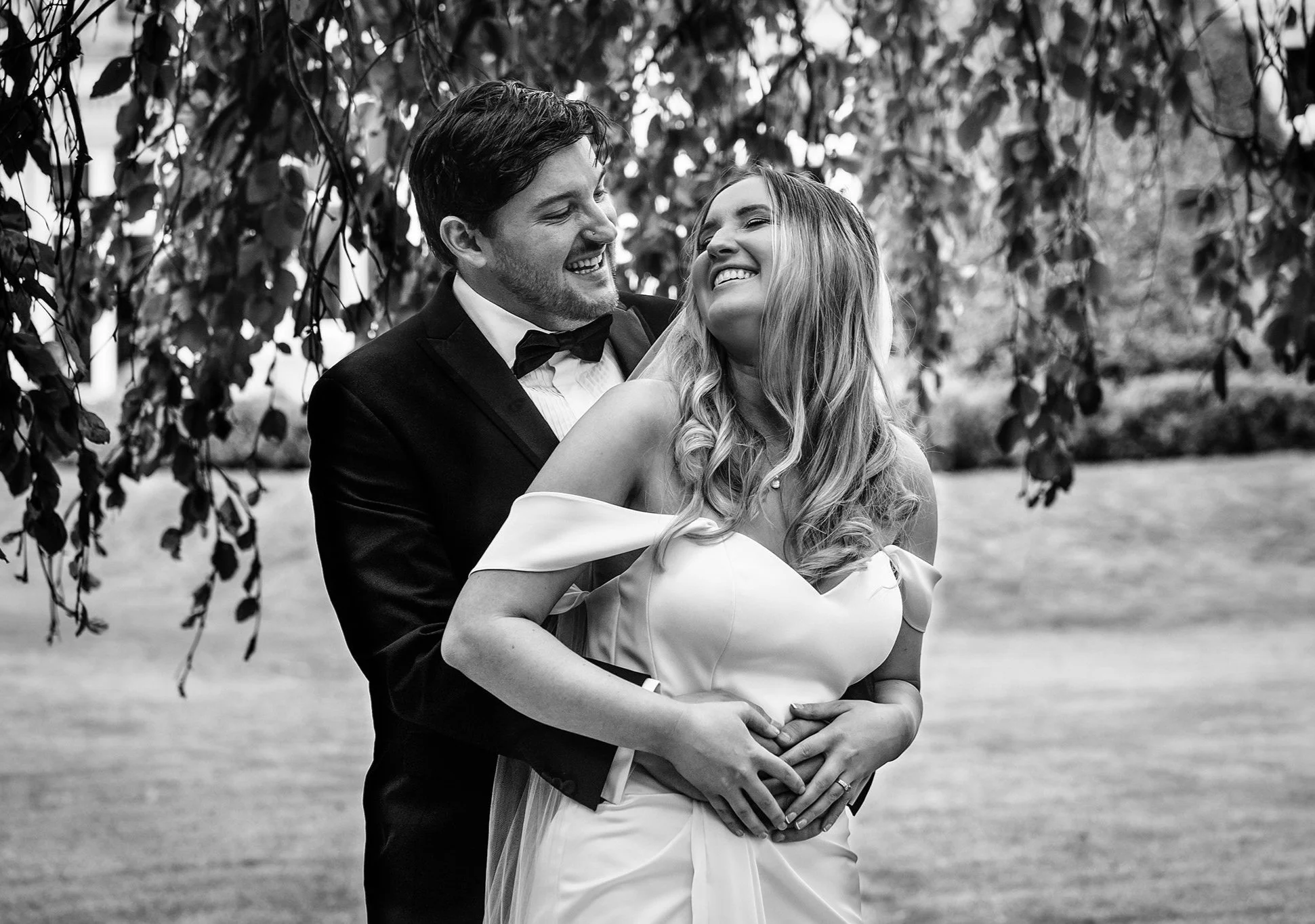 Jo and Nate chose beautiful venue Pendrell Hall, located near Codsall Wood in Staffordshire, for their late October wedding. They opted for a civil ceremony in the lovely Arts and Crafts-style Morning Room, with its gorgeous wooden wall panelling, a decorative arcaded overmantle, and Victorian plasterwork. Jo chose an elegant wedding dress with clean lines, dropped shoulders and a thigh-high split in the skirt that looked fantastic on her, paired with a long veil, while Nate wore a classic tuxedo with black bowtie, in contrast to his groomsmen, who were decked out in cream jackets to contrast with the groom. To match the autumnal date, Jo’s bouquet featured soft peachy, russet and gold-hued flowers.