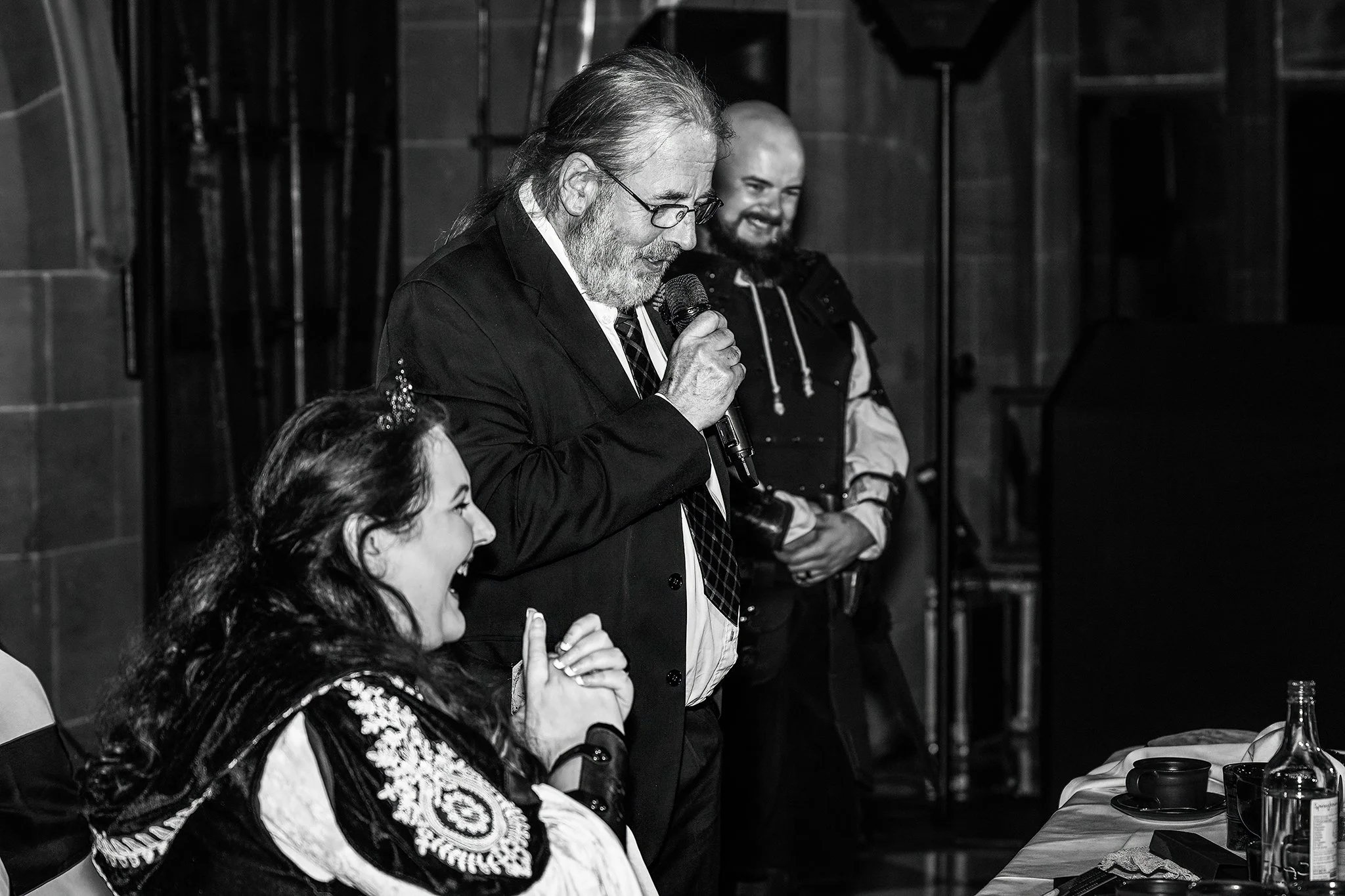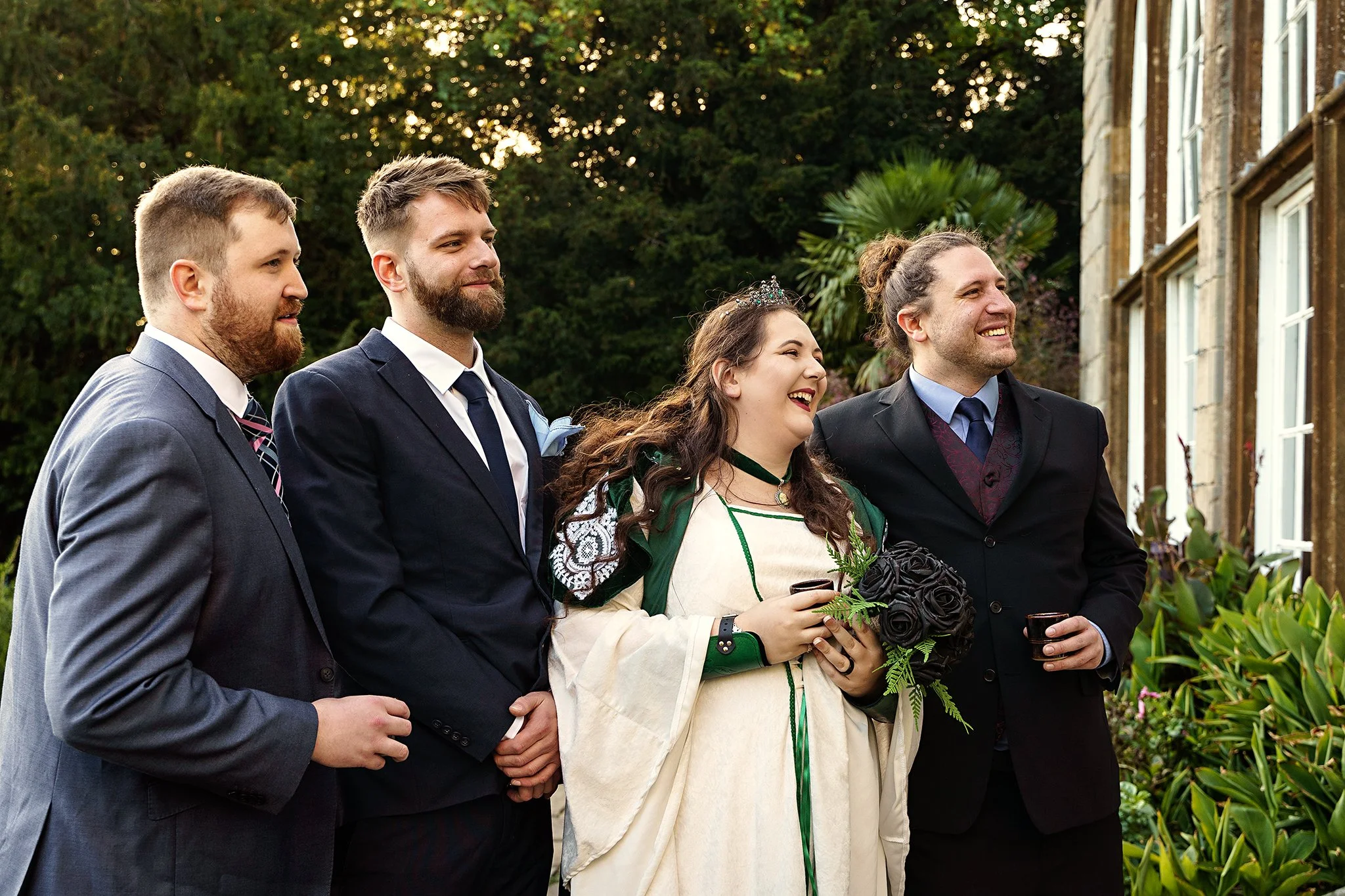 Playful couple Lara and Ben chose Warwick Castle as the backdrop for their early October wedding, and what a stunning and magical setting for their big day this was! Ben and Lara really embraced the castle vibes, opting for medieval-style outfits, with Lara in a rich forest green and white velvety gown with beautiful lace edging and a tiara, and Ben wearing an elaborate outfit that brought Game of Thrones to mind, with embossed leather gauntlets, a big shaggy cape and plenty of authentic detailing.