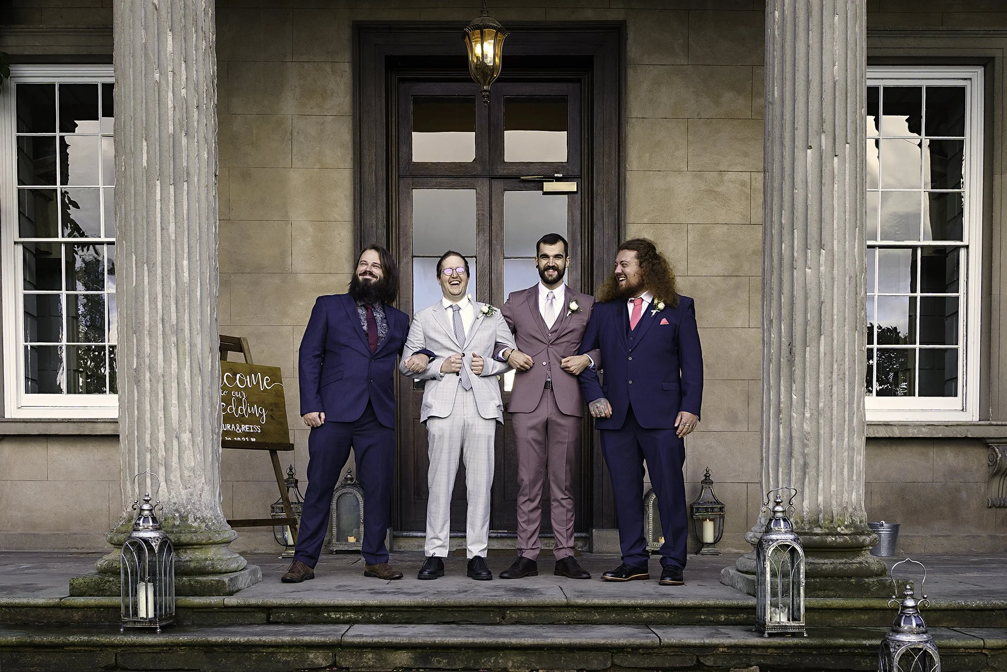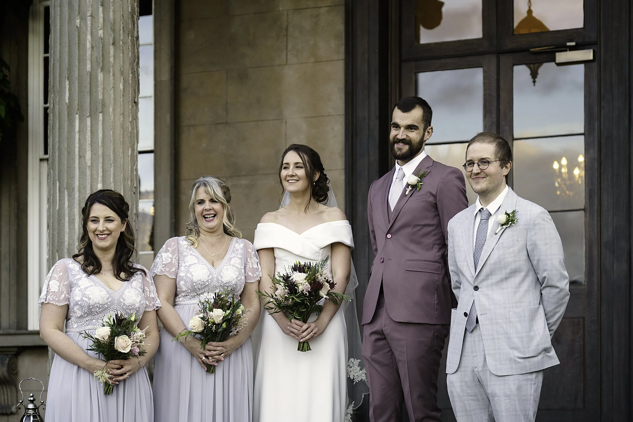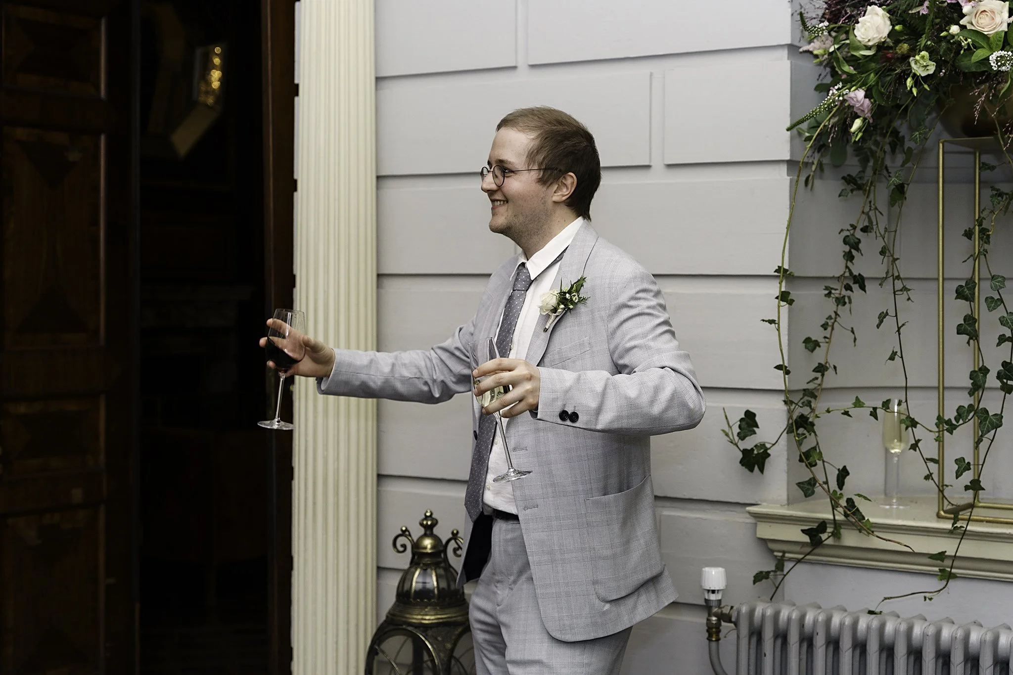 In addition to providing the florals for the bouquets and buttonholes, local floristry wizards Ginger Lily also dressed the house with beautiful arrangements in the brass pedestal bowls in the Great Hall wall alcoves, and with mini-moongates adorning the wedding breakfast tables. I really loved how the softly muted colour palette of the flowers echoed the mavue hue of Reiss’s suit, and the lilac shade of the bridesmaids’ dresses!