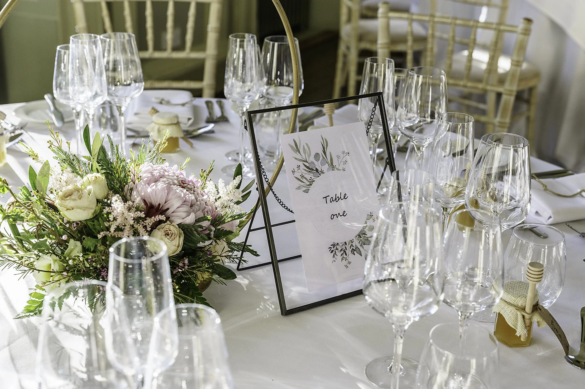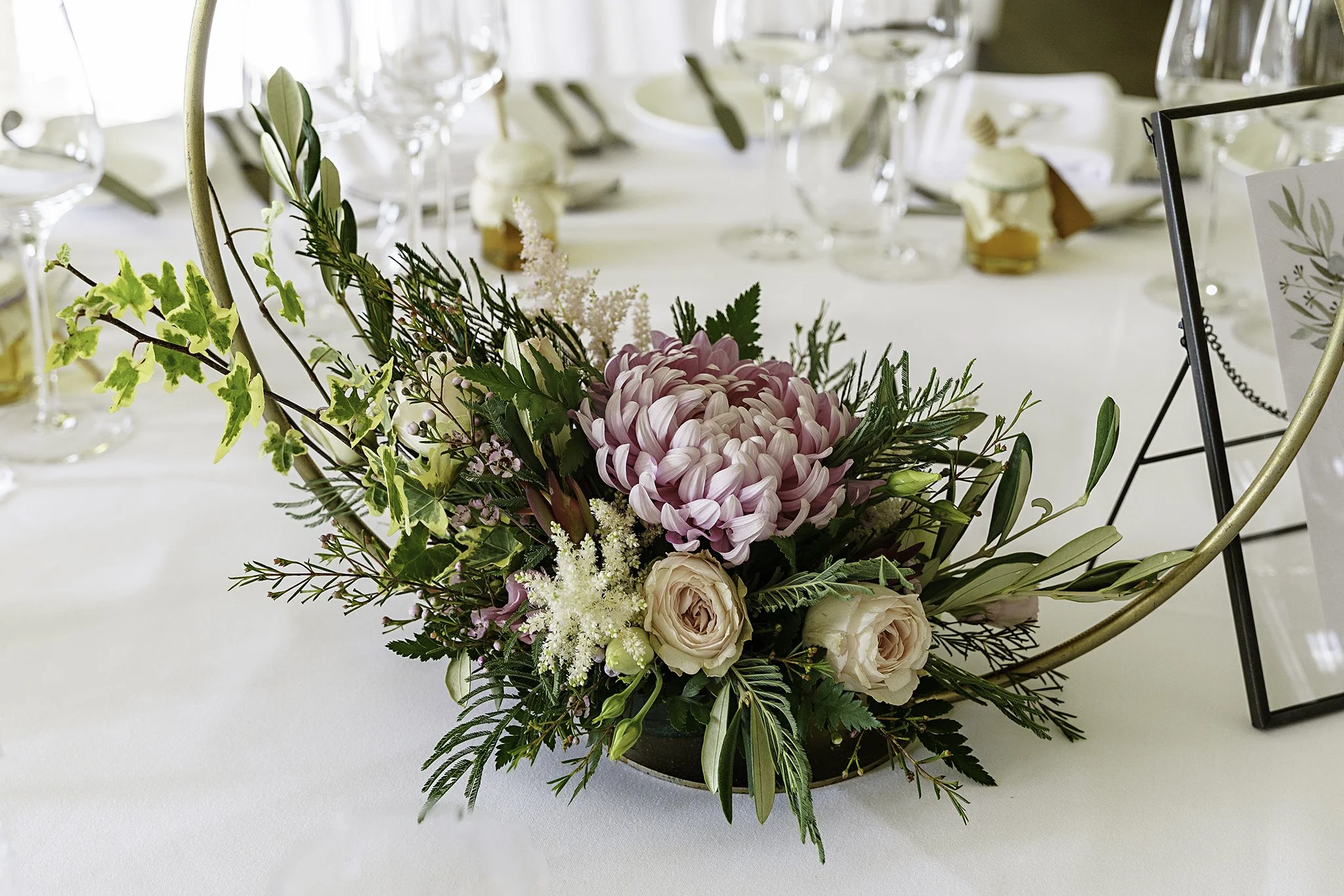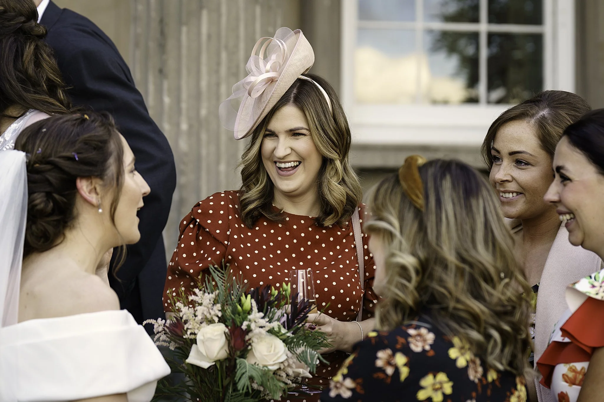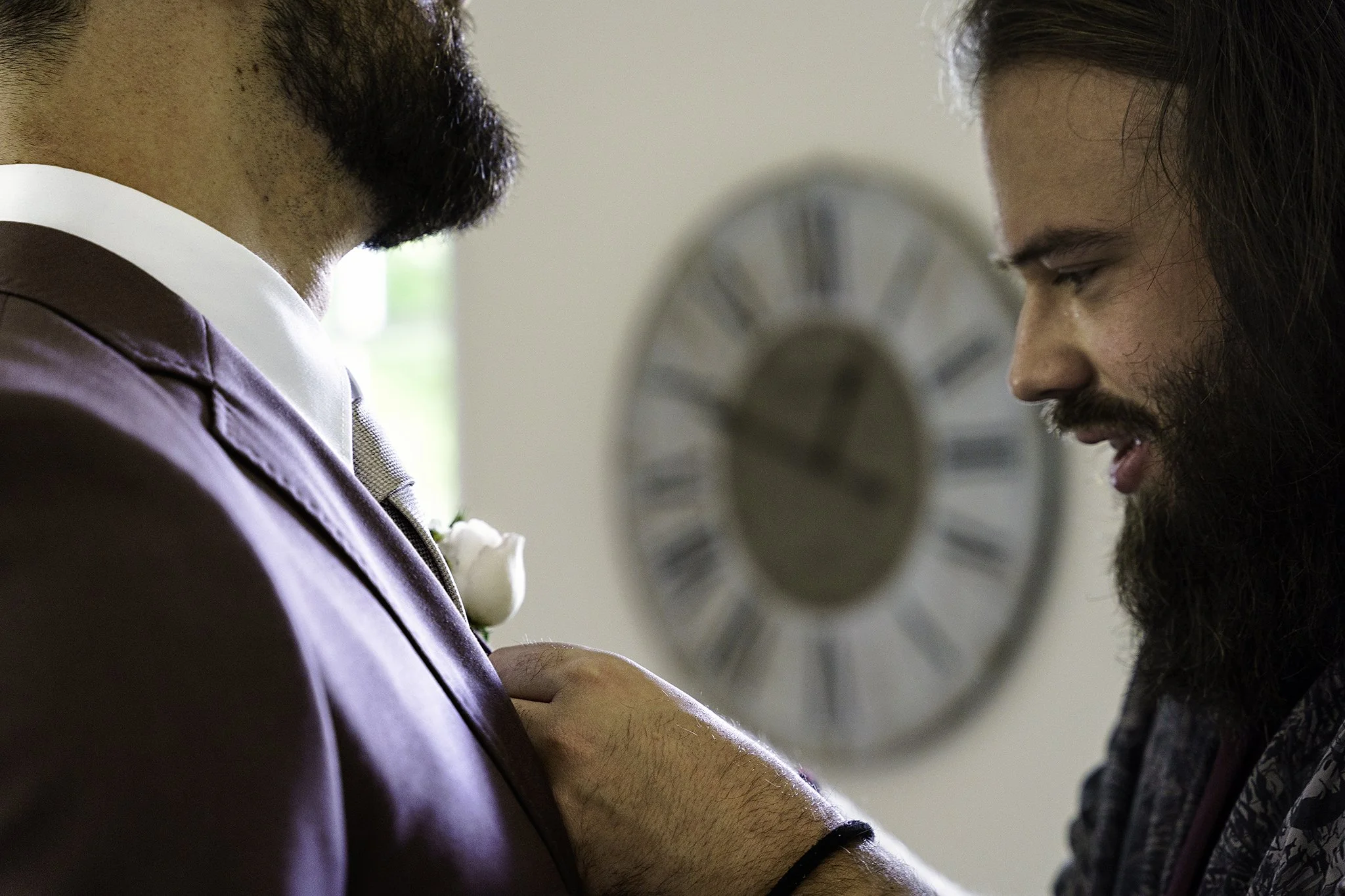 In addition to providing the florals for the bouquets and buttonholes, local floristry wizards Ginger Lily also dressed the house with beautiful arrangements in the brass pedestal bowls in the Great Hall wall alcoves, and with mini-moongates adorning the wedding breakfast tables. I really loved how the softly muted colour palette of the flowers echoed the mavue hue of Reiss’s suit, and the lilac shade of the bridesmaids’ dresses!