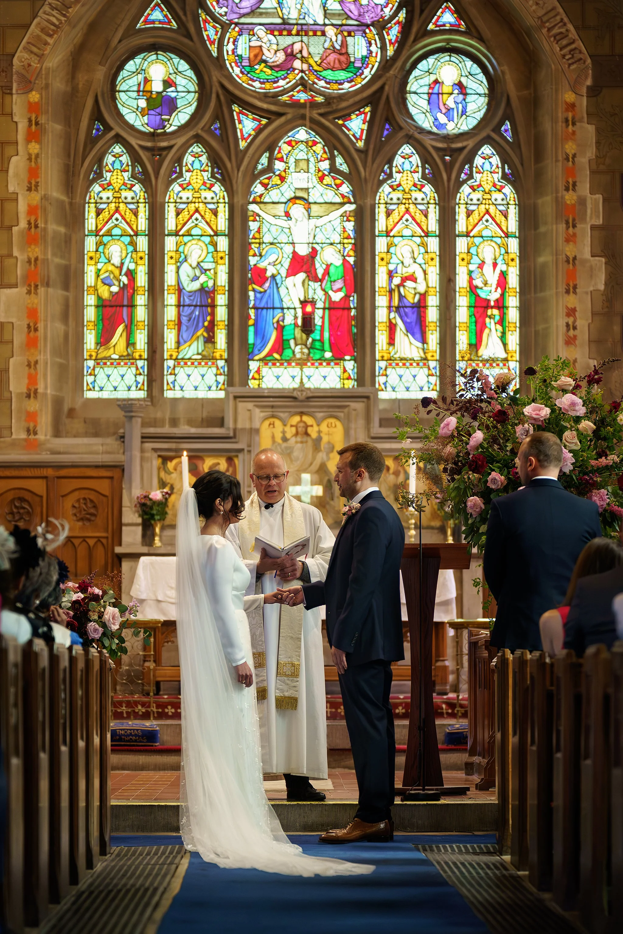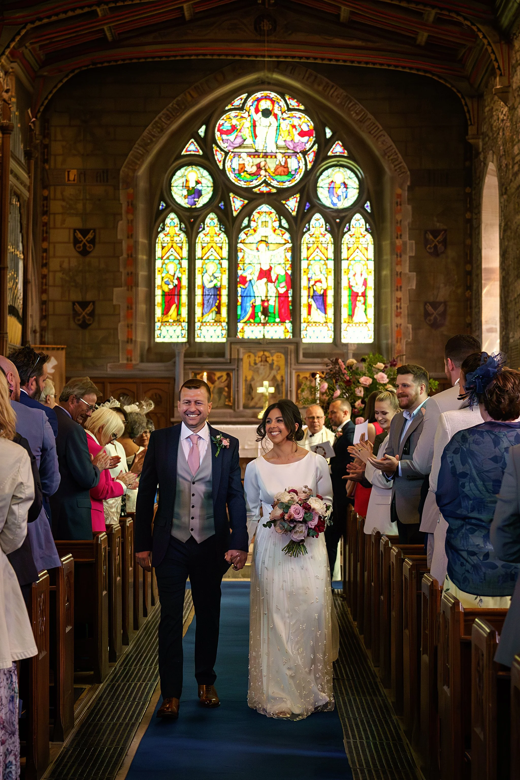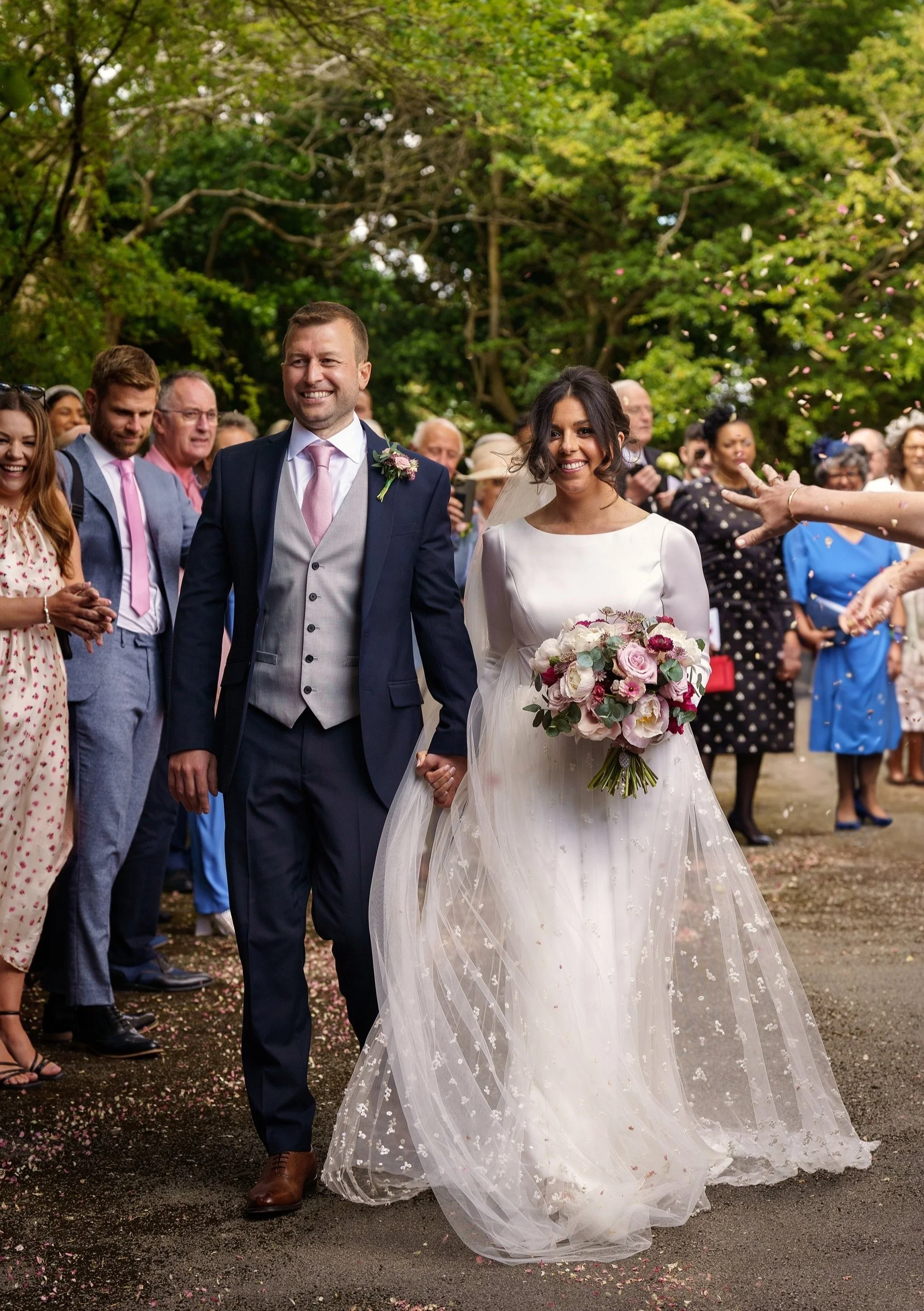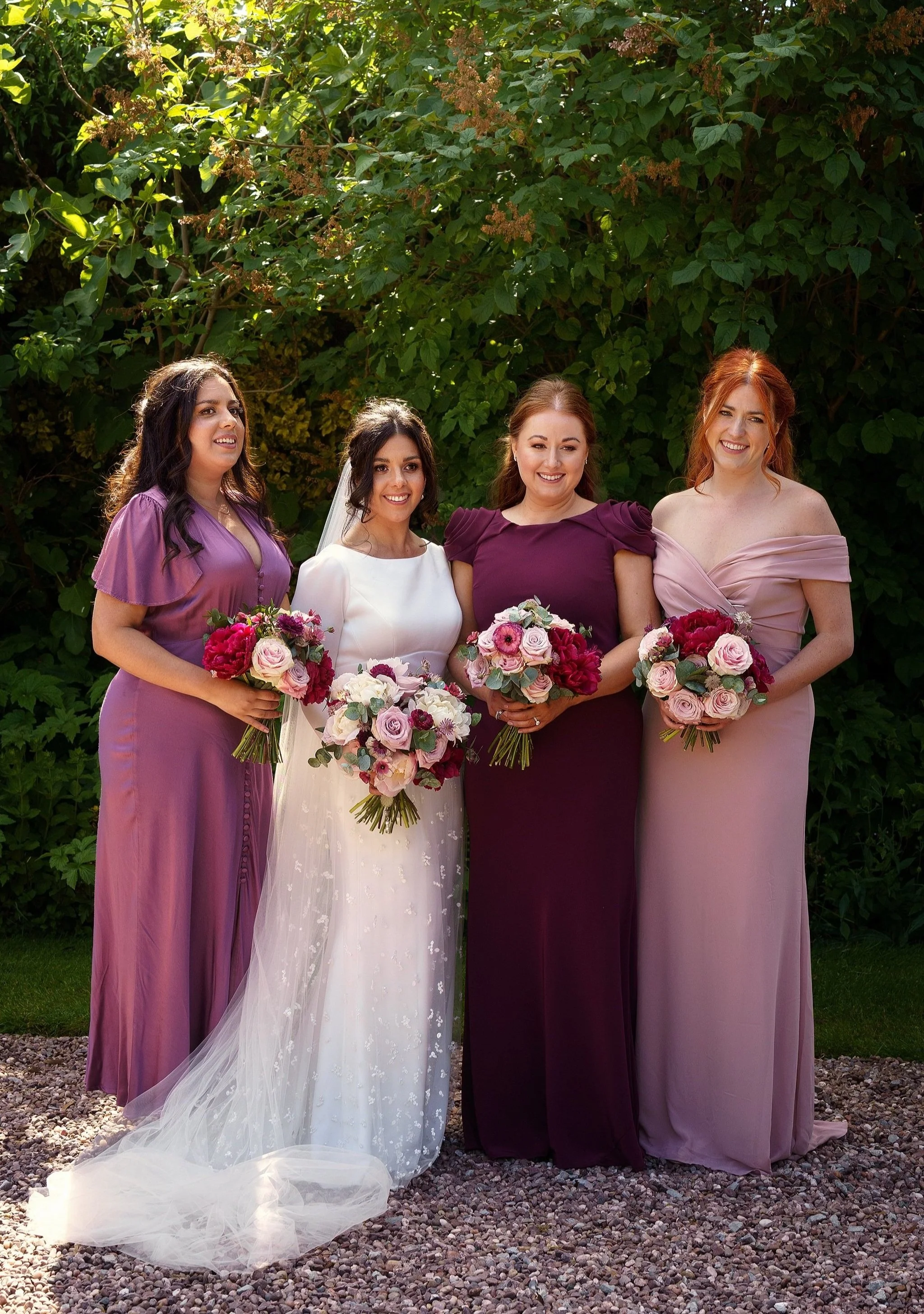 Vanessa and Sean were married at the Church of St Eurgain and St Peter in Northop, Flintshire on a dazzlingly sunny June day, where the beaming mother-of-the-bride walked Vanessa down the aisle with pride. I loved Vanessa’s long-sleeved gown, with its beautiful textured gauzy skirt, and the colours of her bouquet were a perfect complement to the bridesmaids’ dresses in shades of plum, lilac and dusty rose.