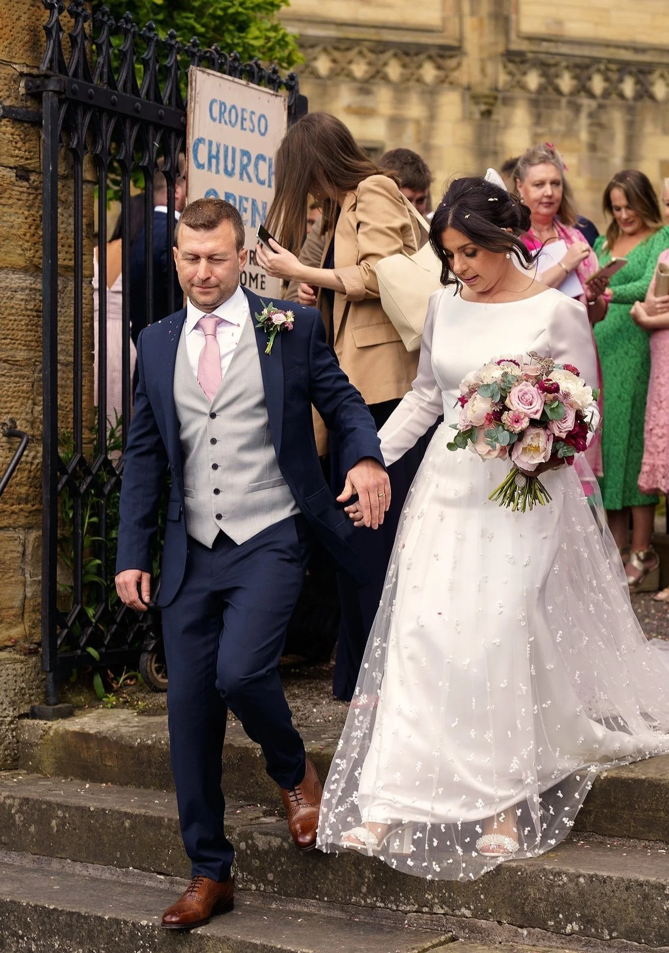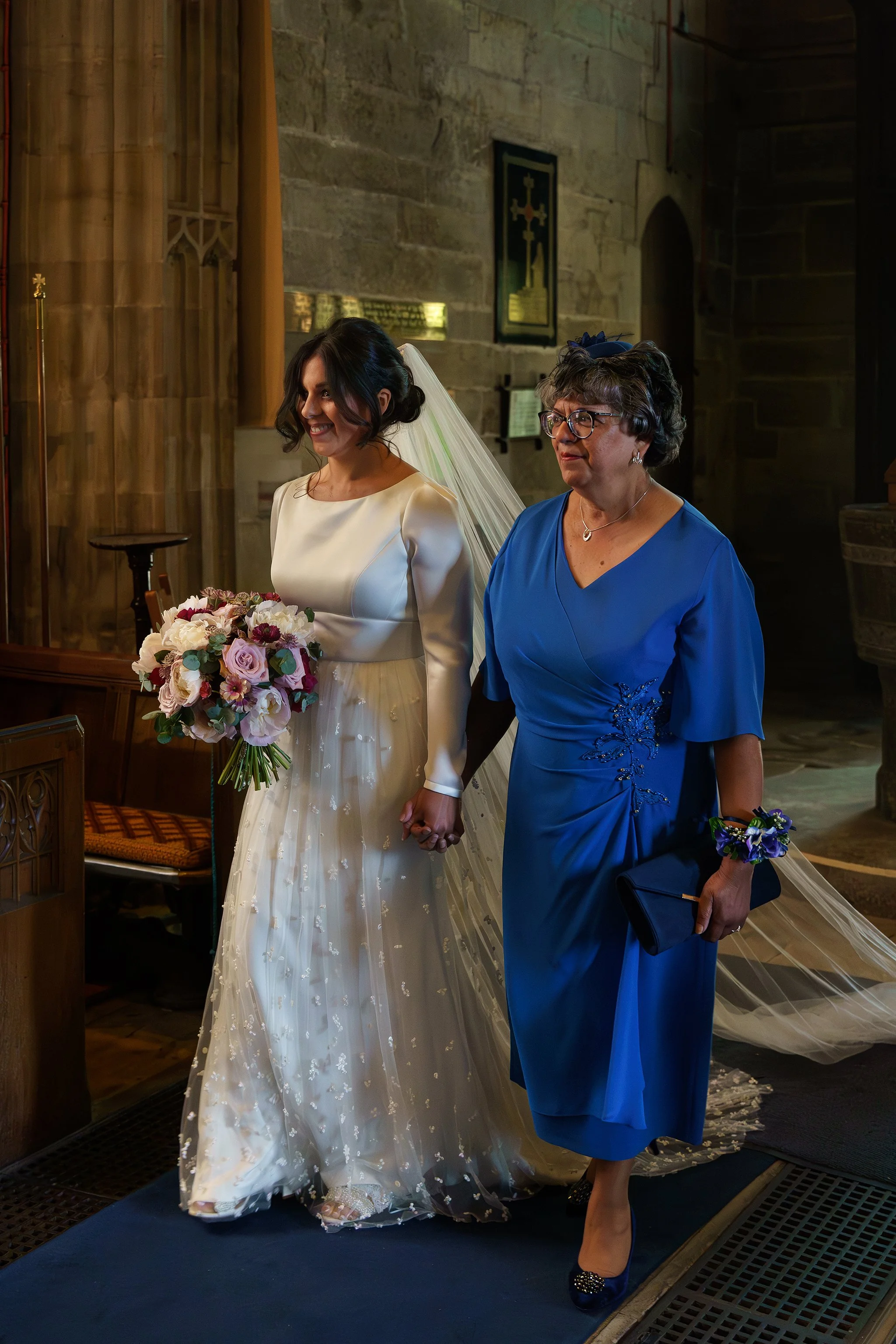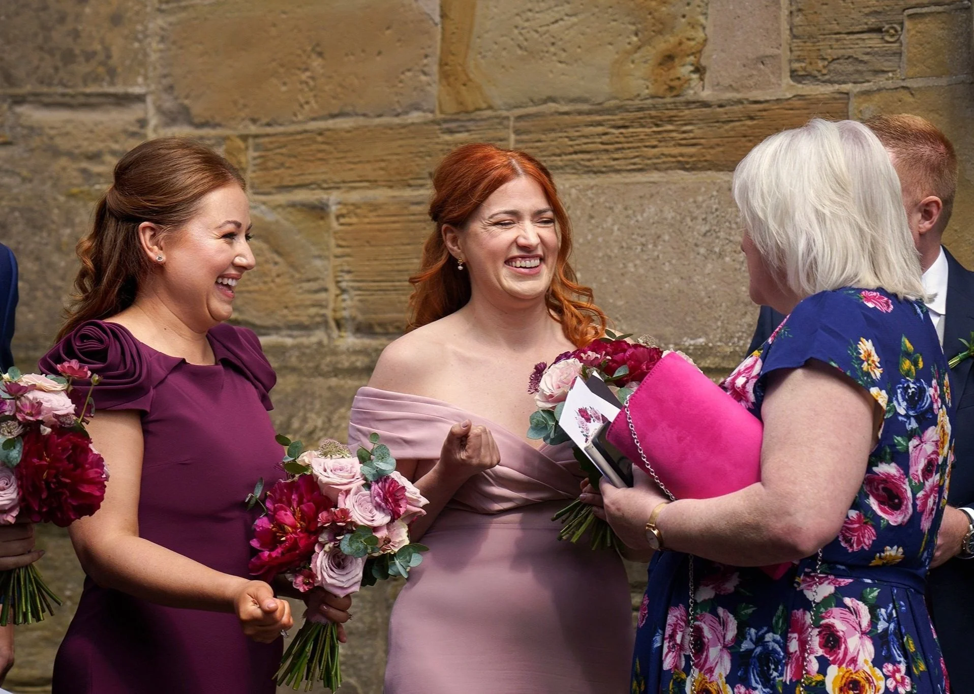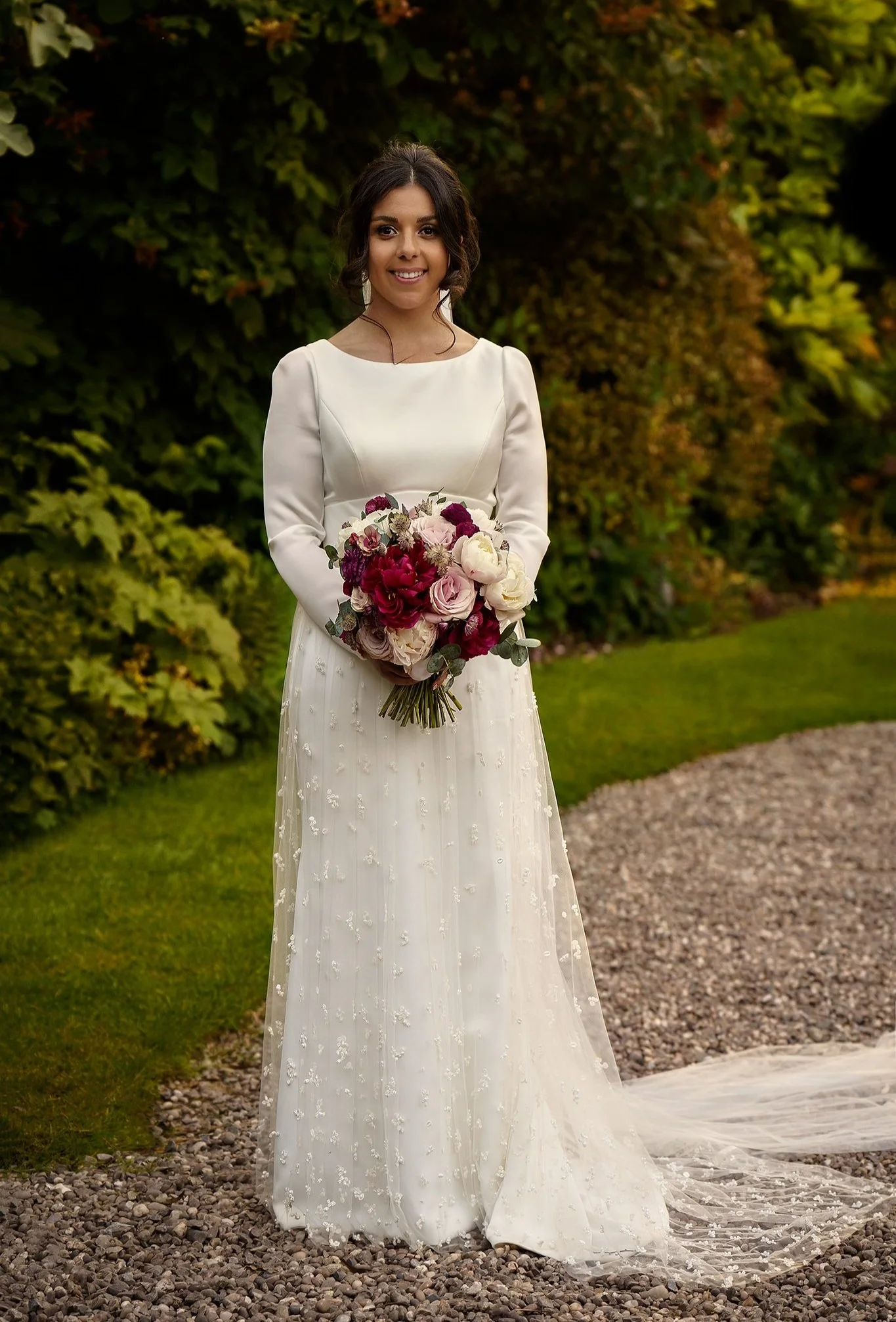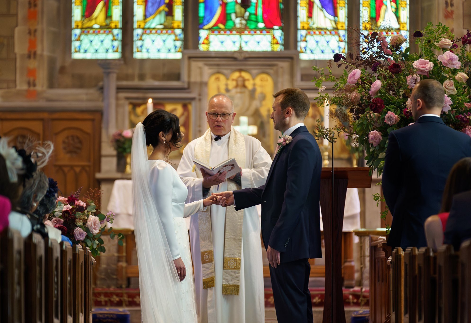 Vanessa and Sean were married at the Church of St Eurgain and St Peter in Northop, Flintshire on a dazzlingly sunny June day, where the beaming mother-of-the-bride walked Vanessa down the aisle with pride. I loved Vanessa’s long-sleeved gown, with its beautiful textured gauzy skirt, and the colours of her bouquet were a perfect complement to the bridesmaids’ dresses in shades of plum, lilac and dusty rose.