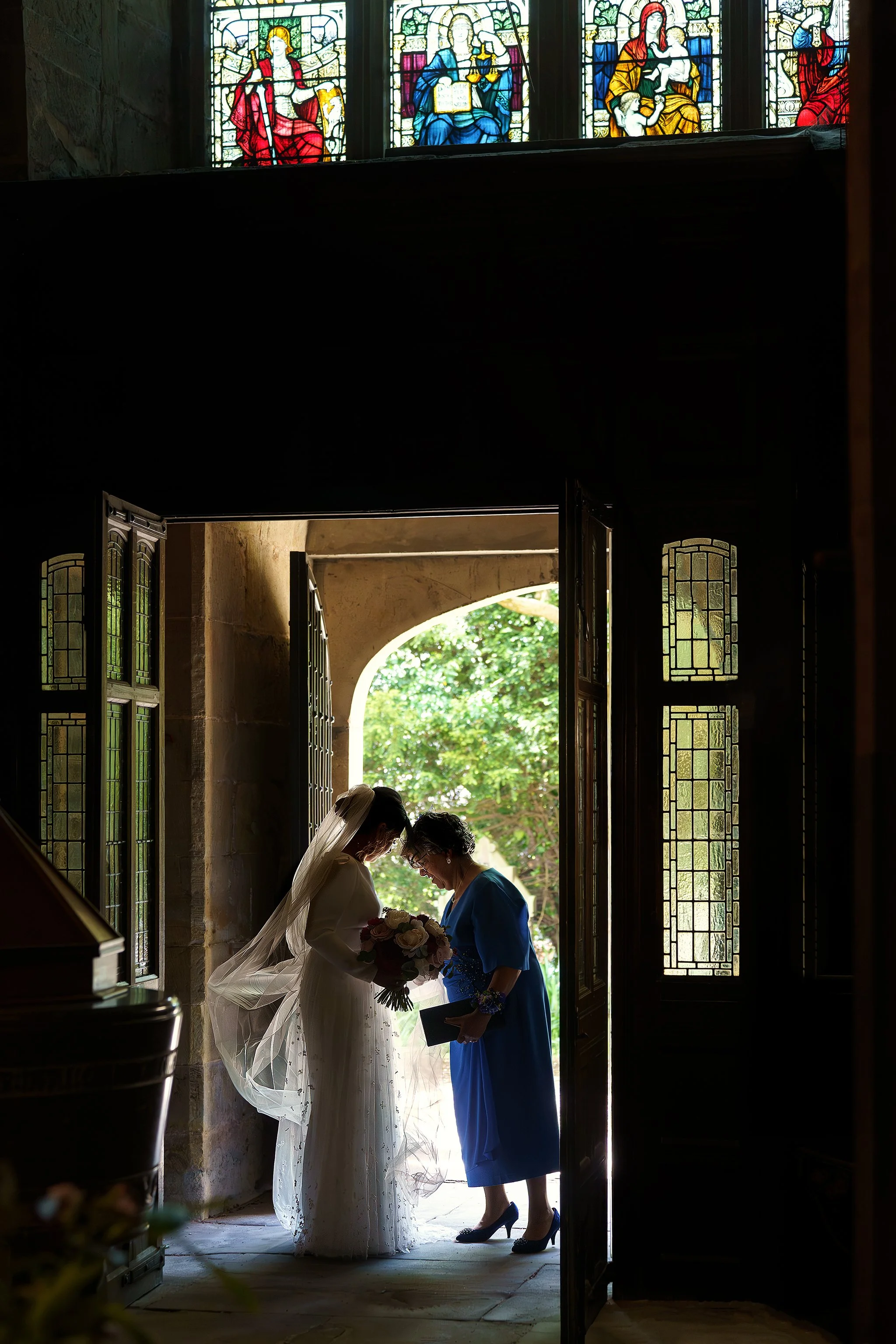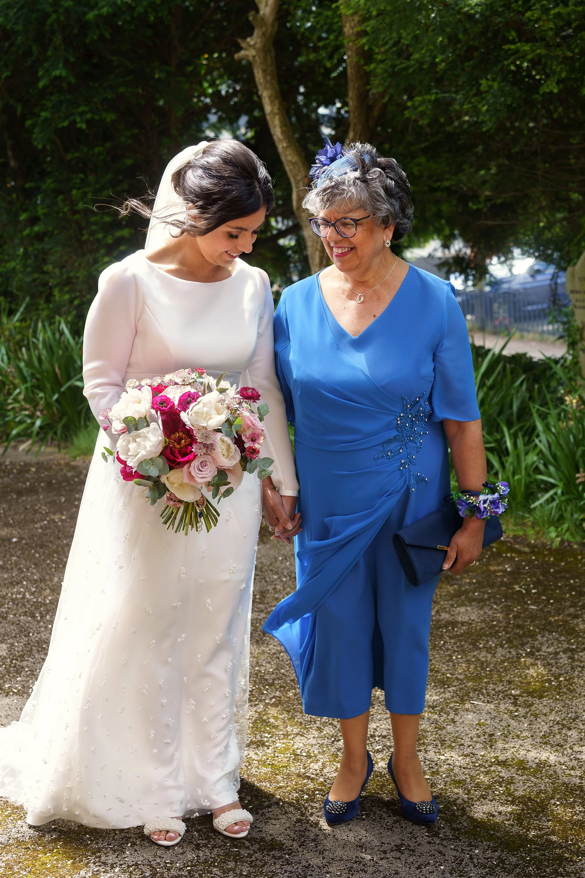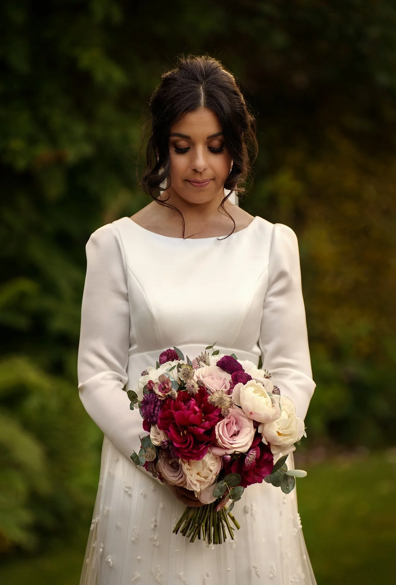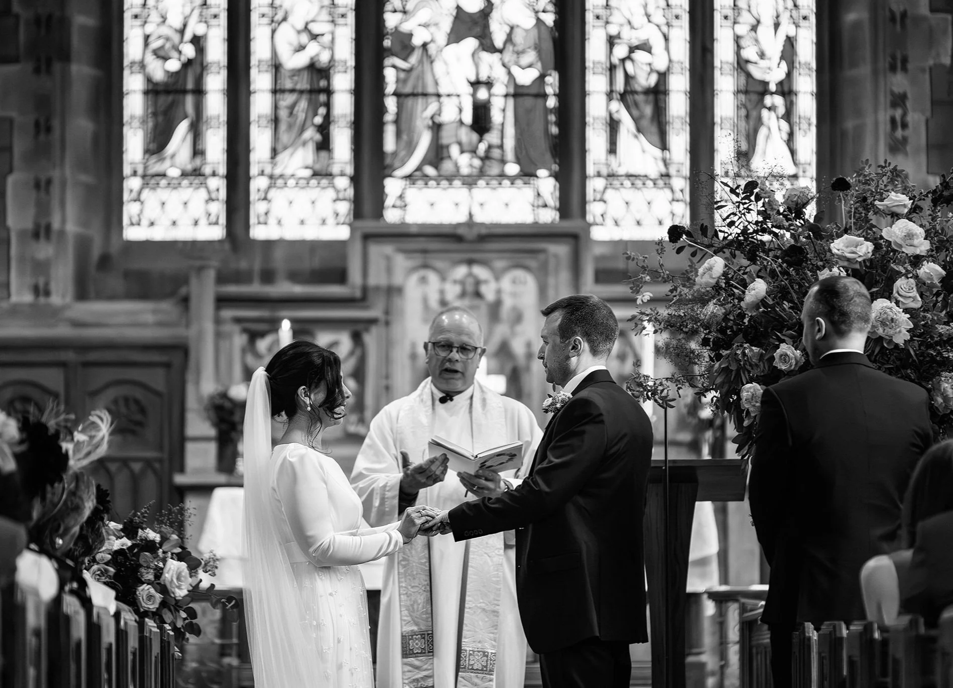 Vanessa and Sean were married at the Church of St Eurgain and St Peter in Northop, Flintshire on a dazzlingly sunny June day, where the beaming mother-of-the-bride walked Vanessa down the aisle with pride. I loved Vanessa’s long-sleeved gown, with its beautiful textured gauzy skirt, and the colours of her bouquet were a perfect complement to the bridesmaids’ dresses in shades of plum, lilac and dusty rose.